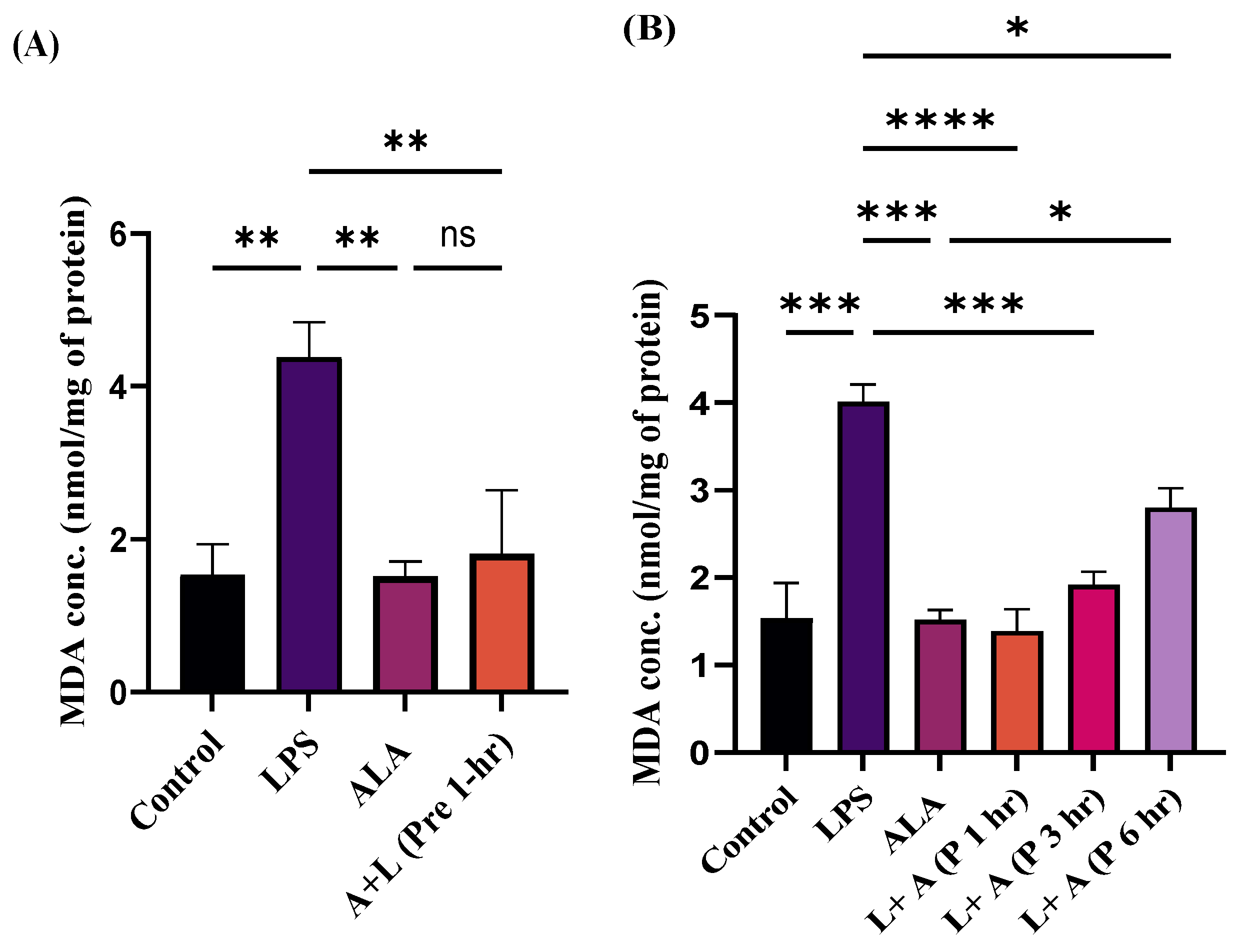 (A,B) Effect of ALA treatment on lipid peroxidation either 1 h before (pre-treatment) or 1, 3, and 6 h post-stimulation with LPS in RAW 264.7 macrophages. Pre- and post-treatment with ALA decreased the MDA concentrations. Maximum effect was observed at 1 h pre- and post-treatment. Effects of ALA on MDA concentrations are strongly time-dependent. Results are expressed in nmol/mg of protein and represented as mean ± SEM (n = 3). Each experiment was performed in triplicate on three different days. A one-way ANOVA with a post hoc Tukey test was used. Statistical significance was determined at * p < 0.05; ** p < 0.01; *** p < 0.001; **** p < 0.0001; and non-significant (ns). The quantitative MDA concentration data are provided in Supplementary Table S1.