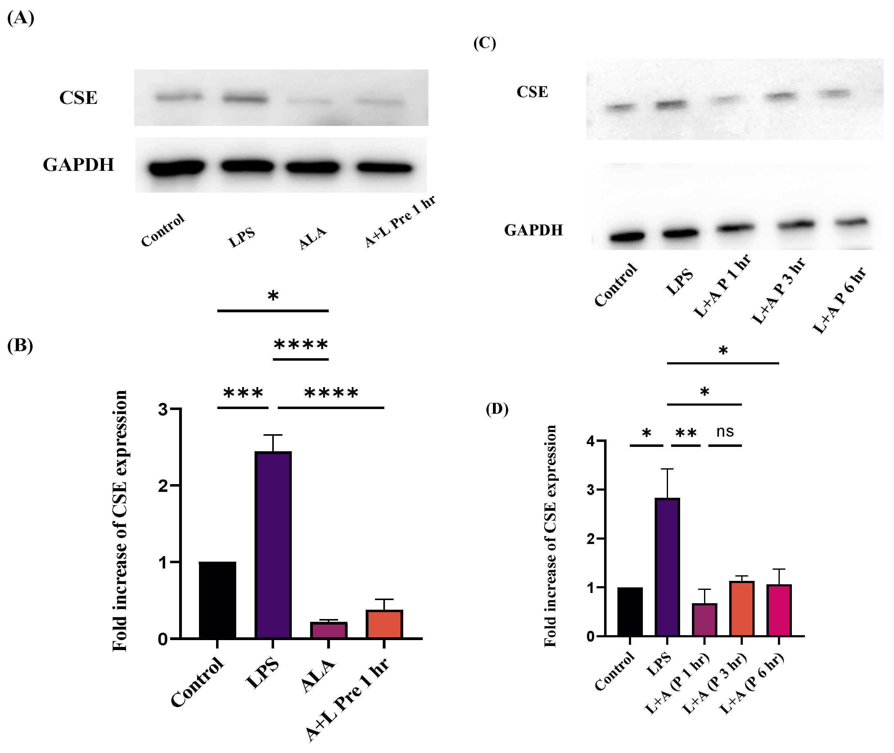 (B,D) The effects of ALA on CSE expression in LPS-stimulated RAW 264.7 macrophages. CSE expression is expressed as a fold increase over control. CSE band intensity was normalized against GAPDH. Representative Western blot images (A,C) are obtained from three independent experiments on three different days. All the data are represented as mean ± SEM (n = 3). A one-way ANOVA with a post hoc Tukey test was used. Statistical significance was determined at * p < 0.05; ** p < 0.01; *** p < 0.001; **** p < 0.0001; and non-significant (ns). The densitometric quantification of Western blots are provided in Supplementary Table S1.