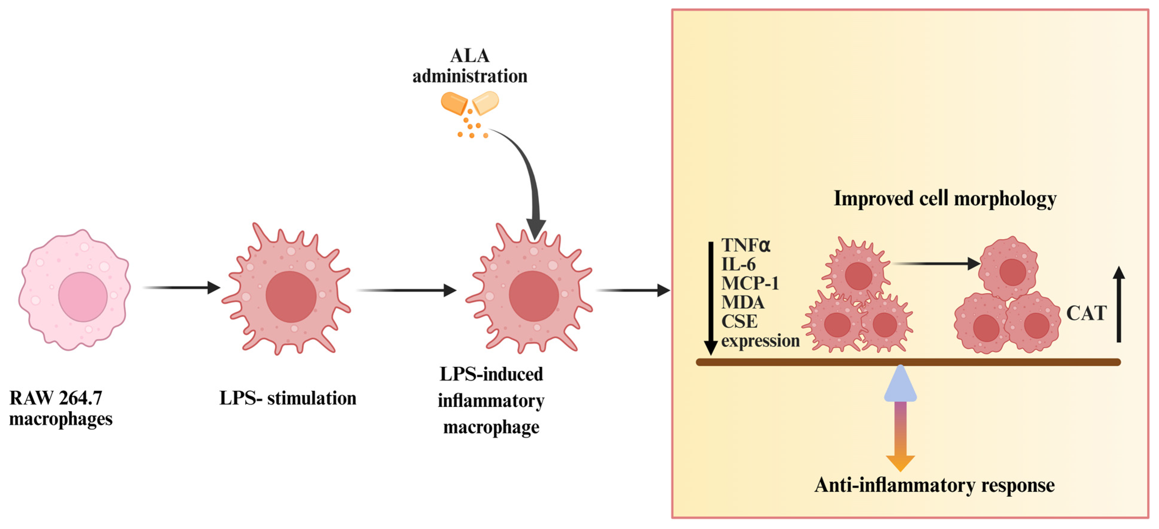 LPS stimulation significantly disrupted the morphology of RAW 264.7 macrophages. Treatment with ALA decreased the levels of TNF-α, IL-6, MCP-1, MDA, and CSE expression, increased the CAT activity, and preserved the morphology of RAW 264.7 macrophages.
