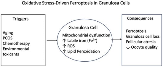 Oxidative stress induces ferroptosis in granulosa cells. Chronic oxidative stress resulting from ageing, metabolic disorders, chemotherapy, or environmental toxins may disrupt the iron equilibrium and mitochondrial activity of granulosa cells. Ferroptotic cell death occurs when ROS accumulate, the labile iron pool increases, and lipid peroxidation transpires. This results in the demise of granulosa cells, follicular atresia, and suboptimal oocyte quality.