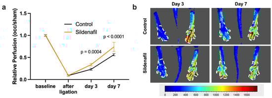 Laser Doppler imaging (LDI) was used to assess initial limb perfusion as well as the restoration of blood flow over time after FAL. As expected, FAL resulted in an immediate reduction in the perfusion in the limb on the occluded side, reflected by a drop in the perfusion ratio between the occluded and contralateral sham side. Over the following days, both the Sildenafil-treated group and the control group exhibited a gradual improvement in relative perfusion, with measurable perfusion recovery occurring by days 3 and 7 post-FAL. Notably, mice receiving Sildenafil displayed a significantly greater restoration of relative perfusion at both time points compared with the controls (Figure 1).