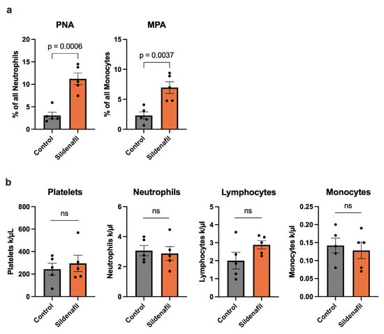 Sildenafil Triggers Circulating Platelet–Neutrophil Aggregate (PNA) and Monocyte–Platelet Aggregate (MPA) Formation During Arteriogenesis. (a) The bar graphs demonstrate the percentage of PNA of all neutrophils and MPA of all monocytes in Sildenafil-treated or control mice 24 h after femoral artery ligation (FAL) detected by flow cytometry. (b) The bar graphs depict the numbers of platelets, neutrophils, lymphocytes, and monocytes as evaluated by differential blood count in Sildenafil-treated or control animals 24 h after FAL. (a,b) Statistical analysis was performed using an unpaired t-test (n = 5 animals per group). ns = not significant.