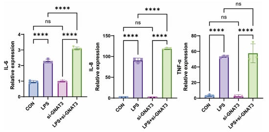 To investigate whether bitter receptor agonists exert anti-inflammatory effects via GNAT3, we compared inflammatory factor expression levels in wild-type BEAS-2B cells and si-GNAT3-treated BEAS-2B cells following LPS induction. Our initial confirmation of GNAT3 expression in BEAS-2B cells enabled us to directly test its functional necessity. Compared with the normal control group, both GNAT3 mRNA and protein expression levels were significantly reduced in the si-GNAT3 group (Figure 4). Under 1.0 µg/mL LPS stimulation, IL-6 and IL-8 mRNA expression levels were significantly upregulated in GNAT3-silenced BEAS-2B cells compared to WT cells, while no significant changes were observed in the blank control group (Figure 5).