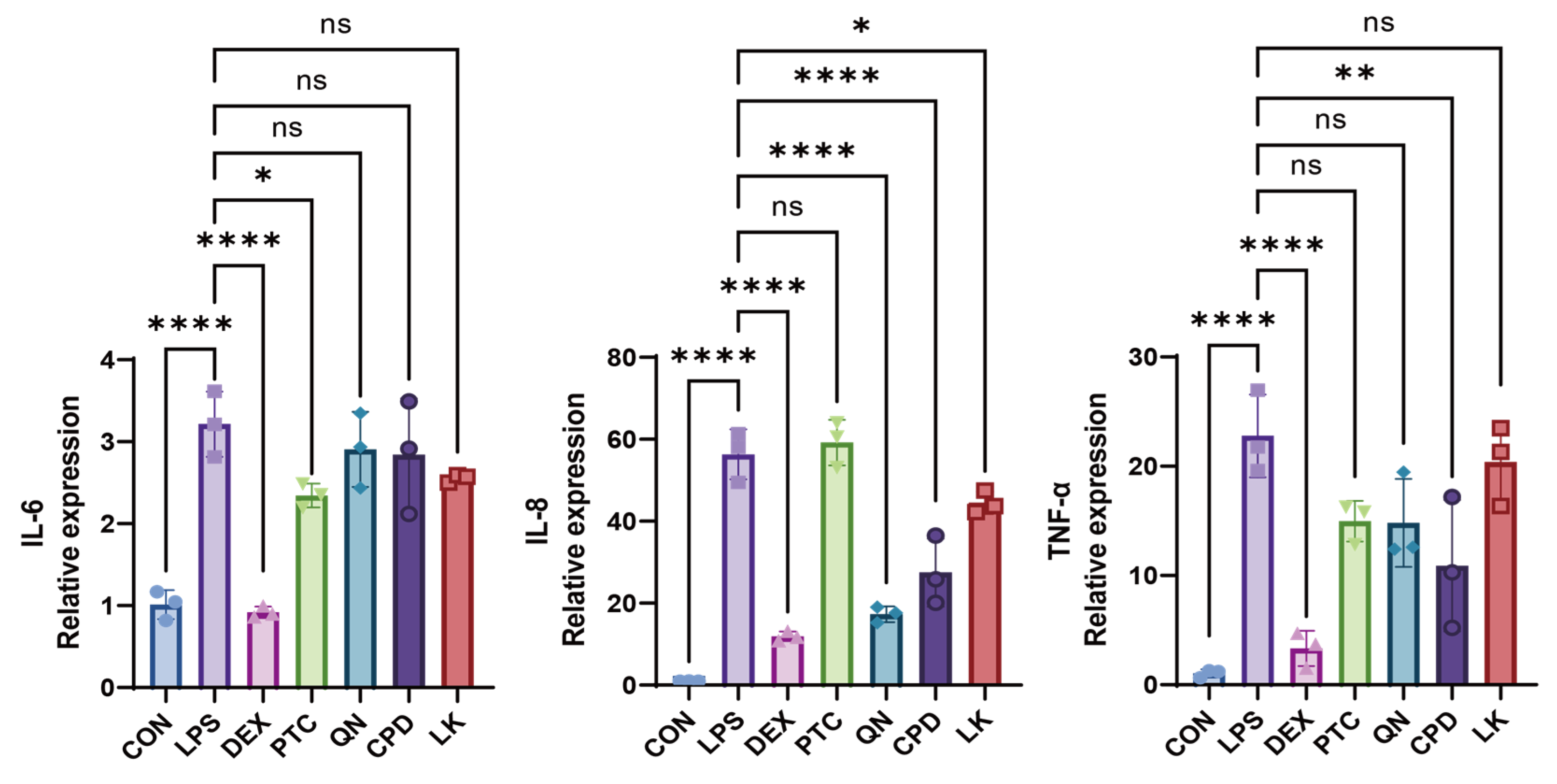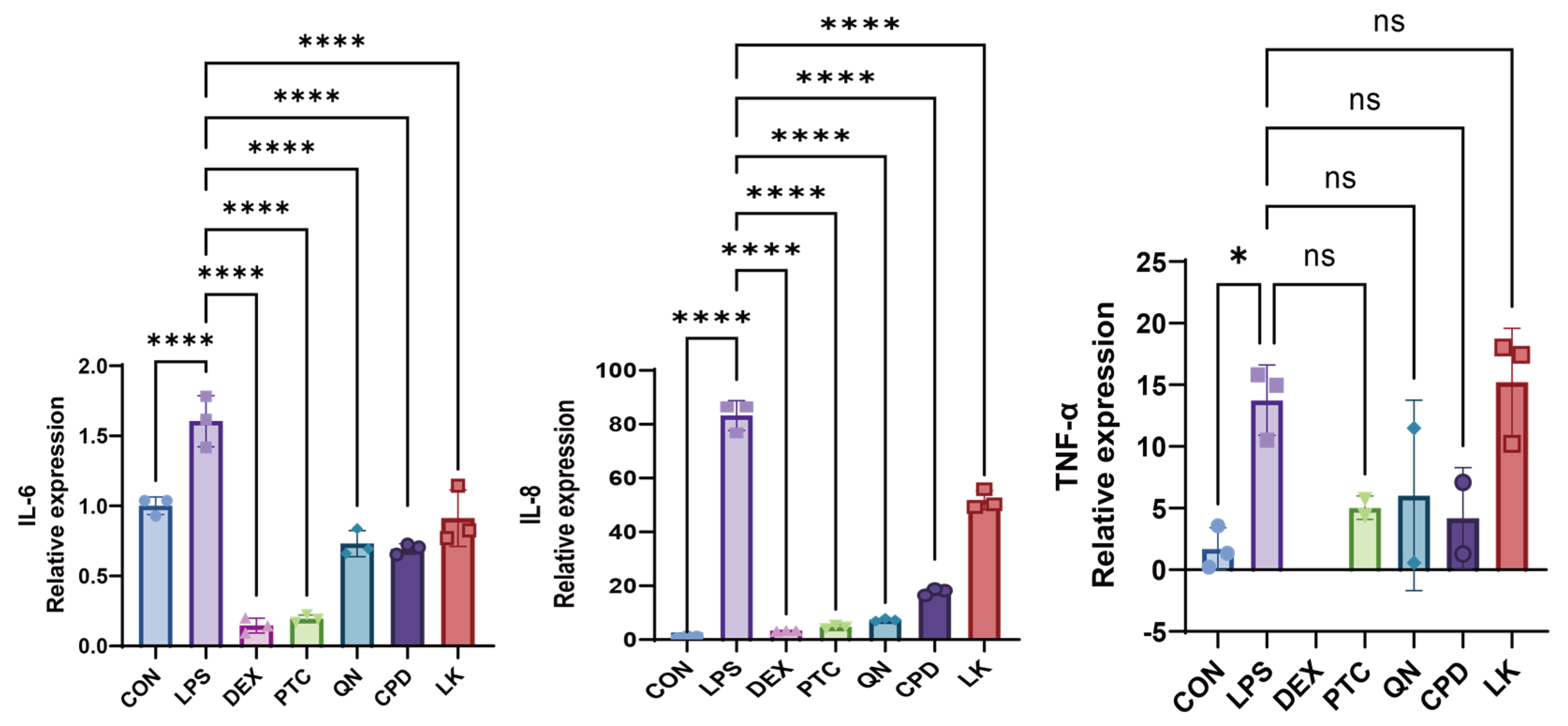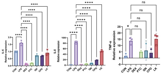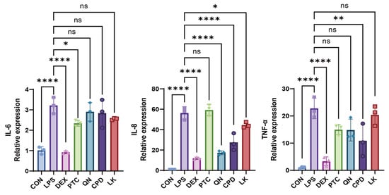 Figure 6. Effects of DEX (0.1 mM), PTC (1.0 mM), QN (50.0 µM), CPD (0.5 mM), and LK (1.0 µM) on IL-6, IL-8, and TNF-α mRNA levels in WT-Type BEAS-2B cells. ns, not significant, * p < 0.05, **** p < 0.0001 compared with the control group. n = 3.