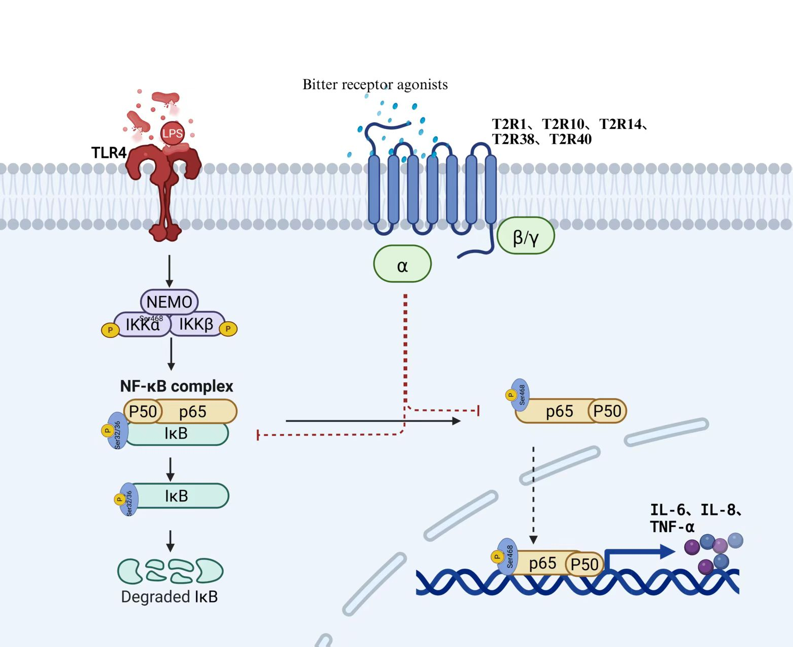 This study investigated how bitter receptor agonists exert anti-inflammatory effects in a pulmonary epithelial cell inflammation model, specifically via their inhibition of inflammatory mediators (e.g., IL-6, IL-8) through the T2R-gustducin/NF-κB signaling pathway. These findings provide theoretical and experimental support for the development of anti-pneumonia drugs targeting T2Rs. Using human bronchial epithelial cells BEAS-2B as a model, this study investigated the roles of four bitter taste receptor agonists PTC, QN, CPD, and LK in LPS-induced inflammatory responses and their GNAT3-dependent regulatory mechanisms. Results revealed that LPS treatment significantly elevated intracellular p-IκB and p-p65 protein levels while promoting IL-6 and IL-8 mRNA expression, successfully establishing an inflammatory cell model. In wild-type cells, bitter receptor agonists PTC, QN, CPD, and LK specifically upregulated the expression of multiple T2R subtypes in BEAS-2B cells. All agonists effectively suppressed LPS-induced inflammatory factor expression and the phosphorylation of key NF-κB pathway proteins, with PTC and CPD exhibiting stronger inhibitory effects. Subsequent siRNA-mediated silencing of the GNAT3 gene significantly attenuated the anti-inflammatory response of BEAS-2B cells to these agonists. Specifically, in si-GNAT3 cells, the inhibition rates of p-p65/p65by PTC, QN, and LK were markedly reduced, while the inhibitory effects of QN and CPD on p-IκB/IκB were also significantly weakened. Notably, GNAT3 silencing did not affect total p65 and IκB protein levels, indicating that these agonists primarily intervene in the NF-κB pathway by regulating phosphorylation processes rather than altering total protein content.