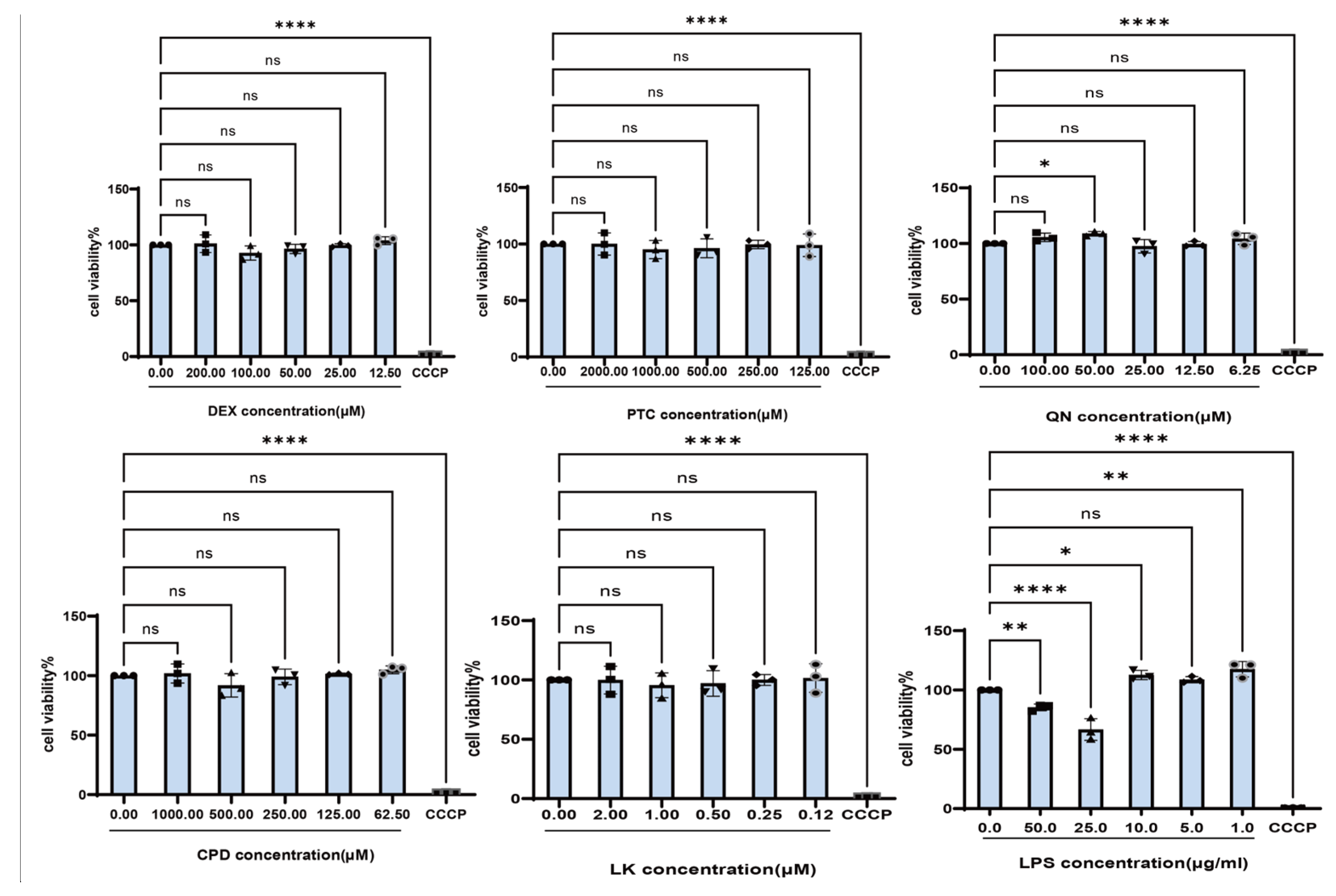 Figure 1. Effects of Different Concentrations of DEX, PTC, Quinine, CPD, LK, and LPS on the Viability of BEAS-2B Cells. ns, not significant, * p < 0.05, ** p< 0.01, **** p < 0.0001 compared with the control group. n = 3.