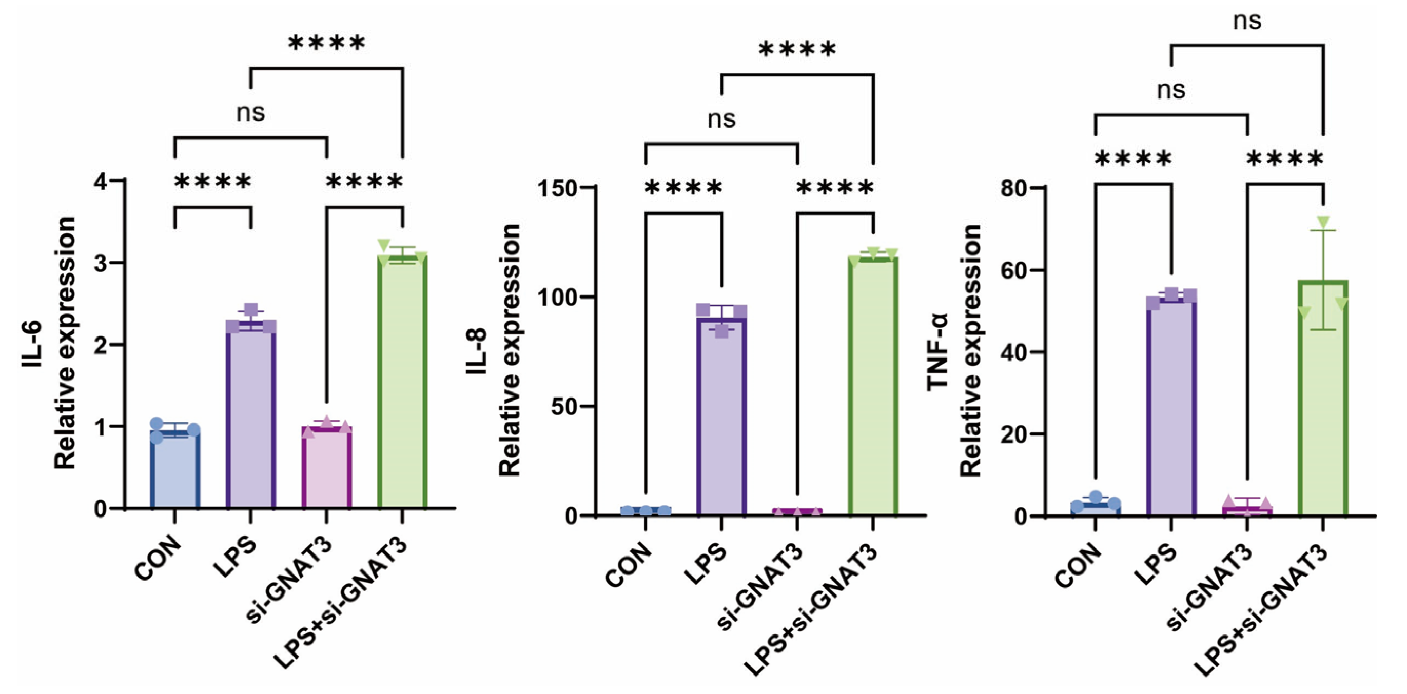 Figure 5. Effects of LPS (1.0 µg/mL) induction on IL-6, IL-8, and TNF-α mRNA levels in WT and si-GNAT3 BEAS-2B cells. ns, not significant, **** p < 0.0001 compared with the control group. n = 3.
