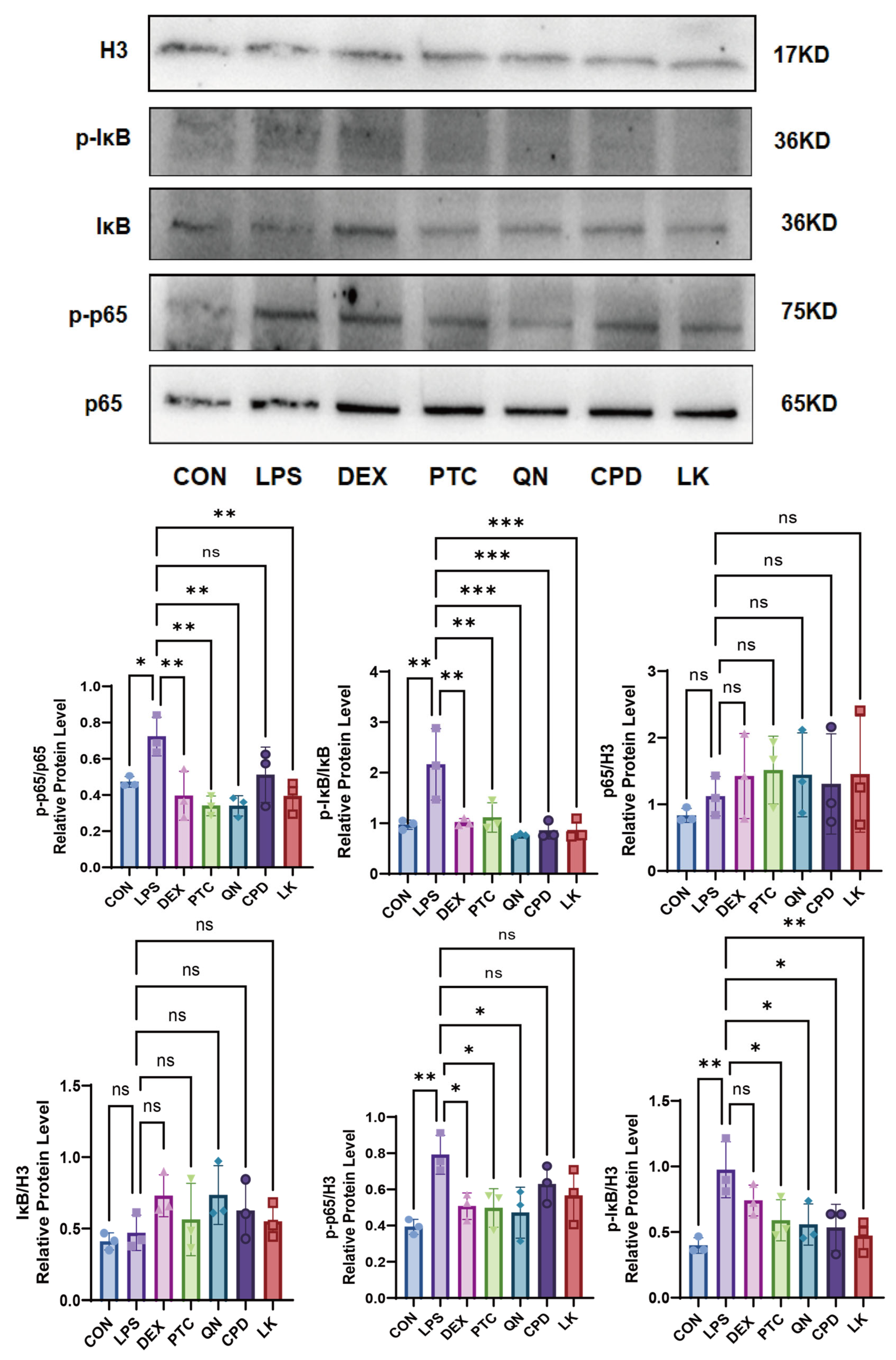 Figure 9. Comparison of the inhibitory effects of DEX (0.1 mM), PTC (1.0 mM), QN (50.0 µM), CPD (0.5 mM), and LK (1.0 µM) on LPS-induced p-p65, p-IκB, p65, and IκB in wild-type BEAS-2B cells. ns, not significant, * p < 0.05, ** p < 0.01, *** p < 0.001. n = 3.