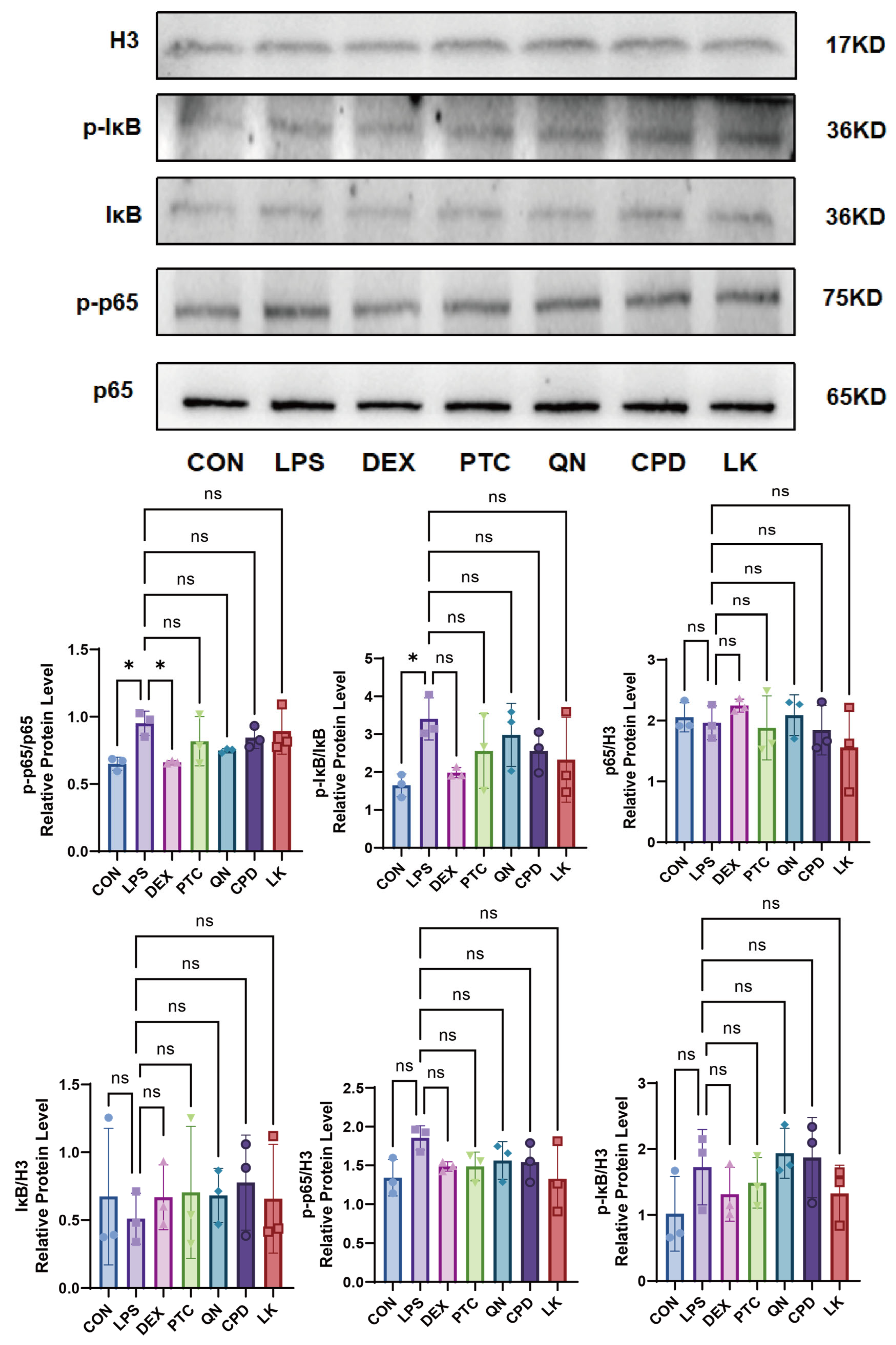 Compared to the control group, LPS treatment significantly upregulated phosphorylation-IκB (p-IκB) and phosphorylation-p65 (p-p65). Concurrently, LPS induced a sharp decrease in total IκB protein levels. The level of total p65 remained relatively stable across all groups. DEX (0.1 mM) effectively reversed the effects of LPS, significantly suppressing the upregulation of p-IκB and p-p65 and preventing IκB degradation. Both PTC (1.0 mM) and CPD (0.5 mM) blocked the LPS-induced production of p-IκB and p-p65 and effectively maintained IκB protein levels. QN (50 µm) and LK (1 µm) also demonstrated clear inhibitory effects, partially reducing the levels of p-IκB and p-p65 and providing a certain degree of protection against IκB degradation (Figure 9).