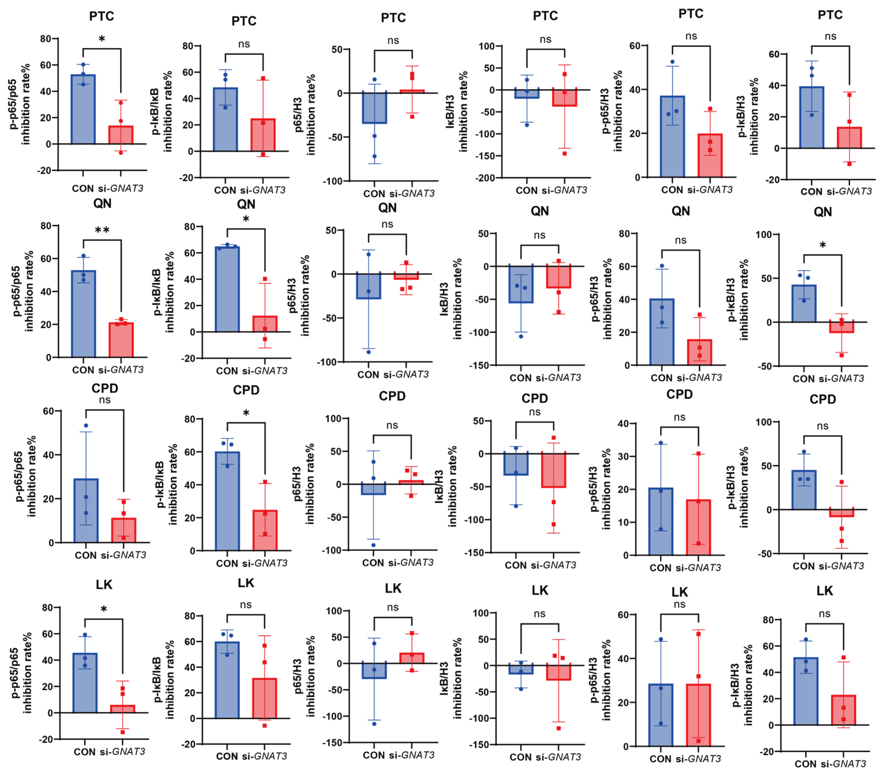 Figure 10. Comparison of the inhibitory effects of DEX (0.1 mM), PTC (1.0 mM), QN (50.0 µM), CPD (0.5 mM), and LK (1.0 µM) on LPS-induced p-p65, p-IκB, p65, and IκB in si-GNAT3 BEAS-2B cells. ns, not significant, * p < 0.05. n = 3.