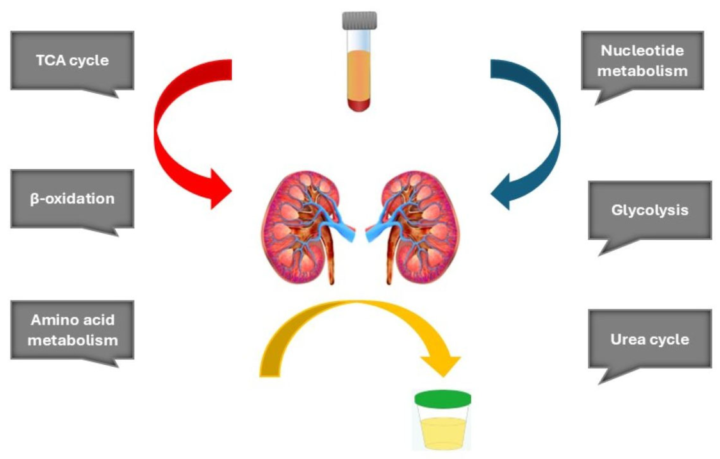 55]. These studies consistently report alterations in key metabolic pathways, including the tricarboxylic acid (TCA) cycle, glycolysis, amino acid metabolism, lipid oxidation, nucleotide metabolism, and the urea cycle (