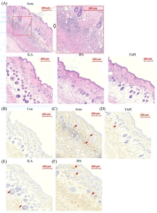 (A) Histological assessment after 21 days in the Acne group and the candidate metabolites groups, scale bar = 100 μm. (B–F) Immunohistochemical analysis of IL-1β expression in skin tissues from control, C. acnes-treated (Acne), and candidate-treated groups (TAPI, IPA, and ILA). Representative images show IL-1β staining in the dermal and perifollicular regions of (B) control, (C) C. acnes-treated, (D) TAPI-treated, (E) IPA-treated, and (F) ILA-treated skin. The Acne group exhibited markedly increased IL-1β staining intensity compared with the control group, whereas TAPI, used as a positive anti-inflammatory control, attenuated C. acnes-induced IL-1β expression. Notably, ILA showed the most pronounced suppression of IL-1β staining among the tested candidates. Arrows indicate representative areas of enhanced IL-1β expression in the dermis and perifollicular regions. Scale bar = 200 μm. CON, control; C. acnes, Cutibacterium acnes; IL-1β, interleukin-1 beta; TAPI, tapinarof; IPA, indole-3-propionic acid; ILA, indole-3-lactic acid.