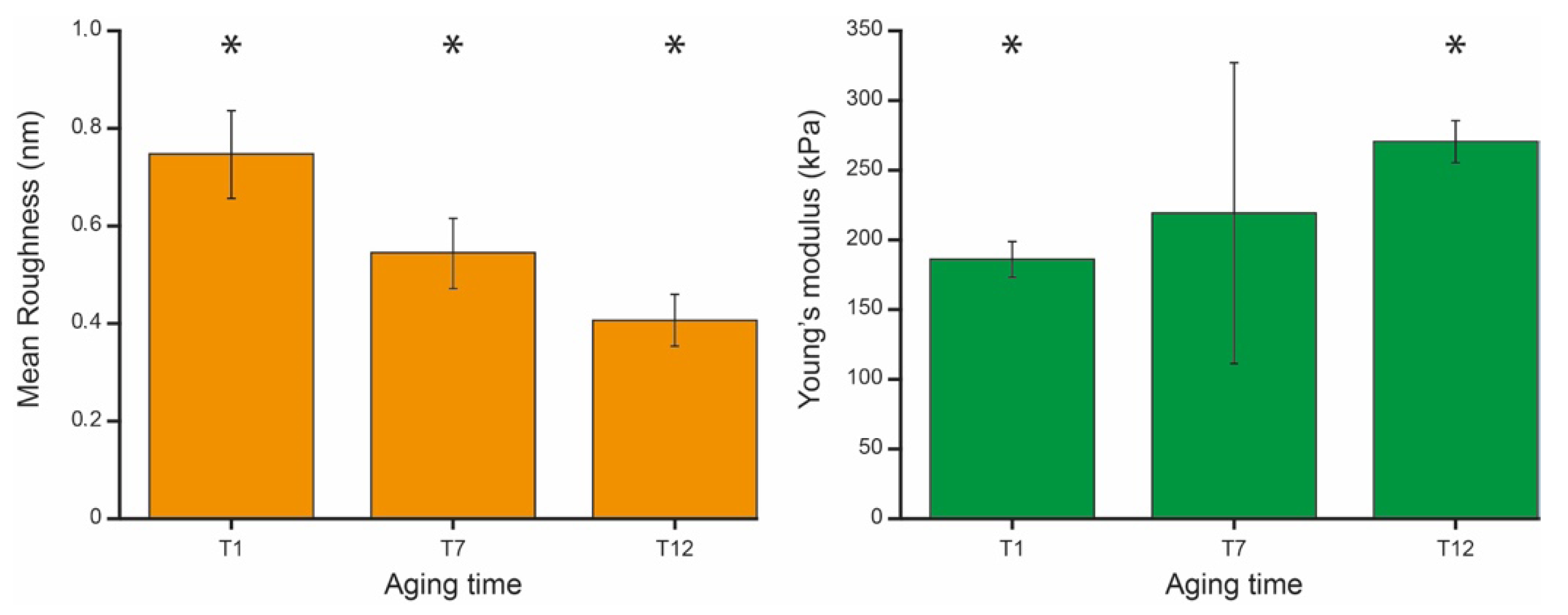 Figure 3, the Young’s modulus increases along the aging in such a way that the cells result stiffer at the late stage of aging with respect to the initial phase. However, while there is a statistically significant difference between the mean values and standard deviations measured at T1 and at T12, at the intermediate aging time (T7) the Young’s modulus values are more spread and cannot be distinguished from younger and older cells. This result reflects the fact that, at an intermediate stage of aging, the RBCs’ mean mechanical properties are scattered. This means that, while in terms of roughness the entire population at T7 is quite similar, in terms of elasticity there are significant number of cells that still behave as young cells and others that already behave like old cells.