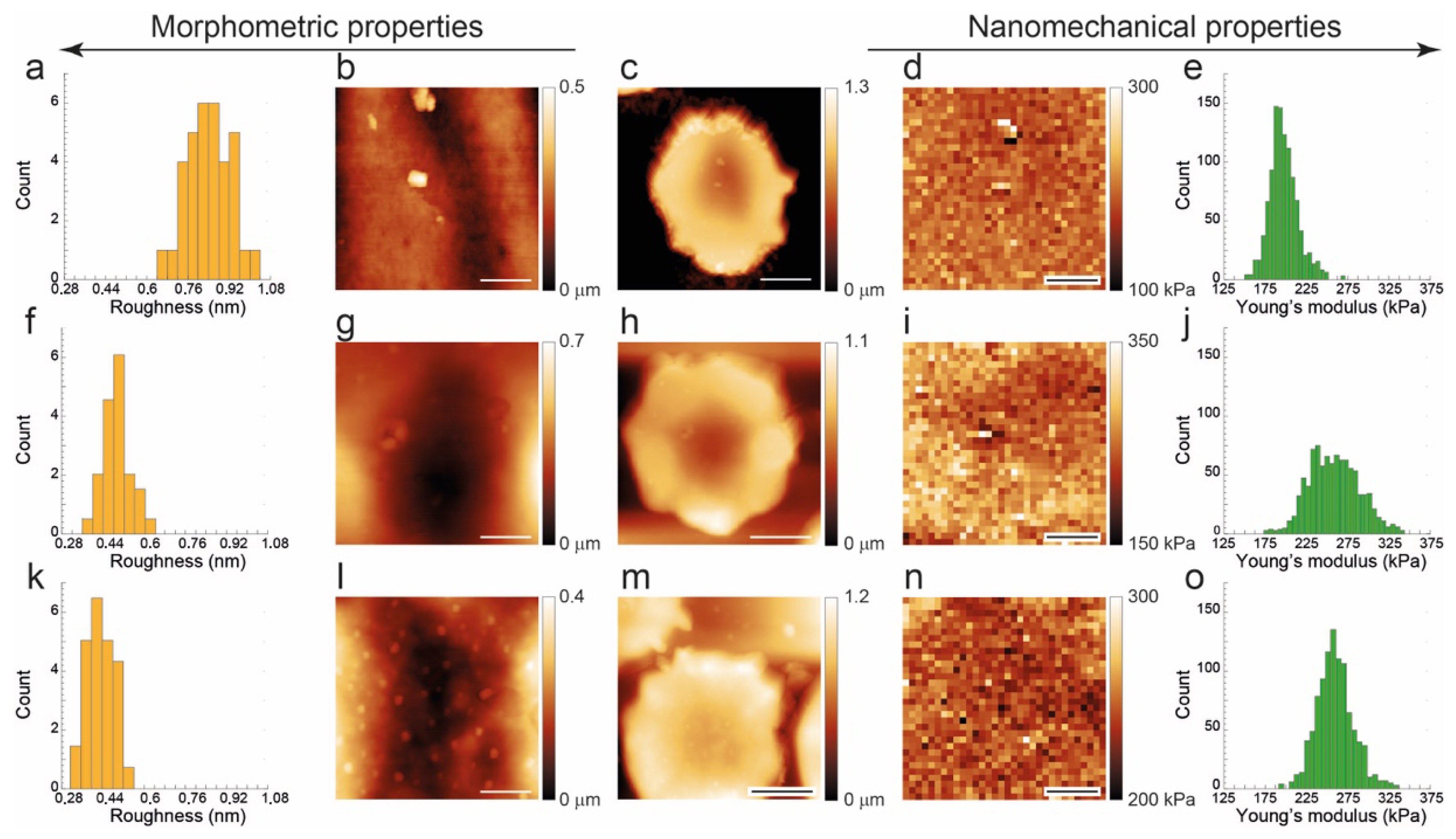 This interesting aspect can be further investigated. Indeed, the spatial resolution of the AFM is unique in its capability to collect both roughness and Young’s modulus maps of the cells, allowing the analysis of the variability of their values at a single-cell level.