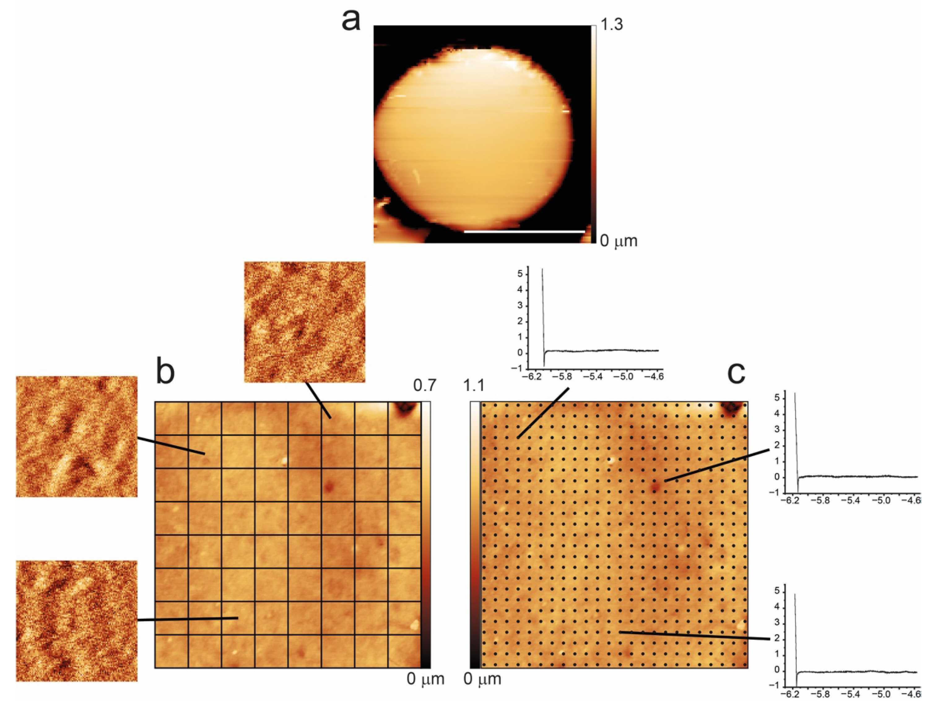 The force curves were collected using the same tip already employed for the morphological measurements, with a tip speed of 10 mm/s and maximum applied force of 4 nN. The typical force curve grid was composed of 40 × 40 or 32 × 32 curves on a 4 × 4 μm2 area, ensuring a distance between curves of 100–125 nm.