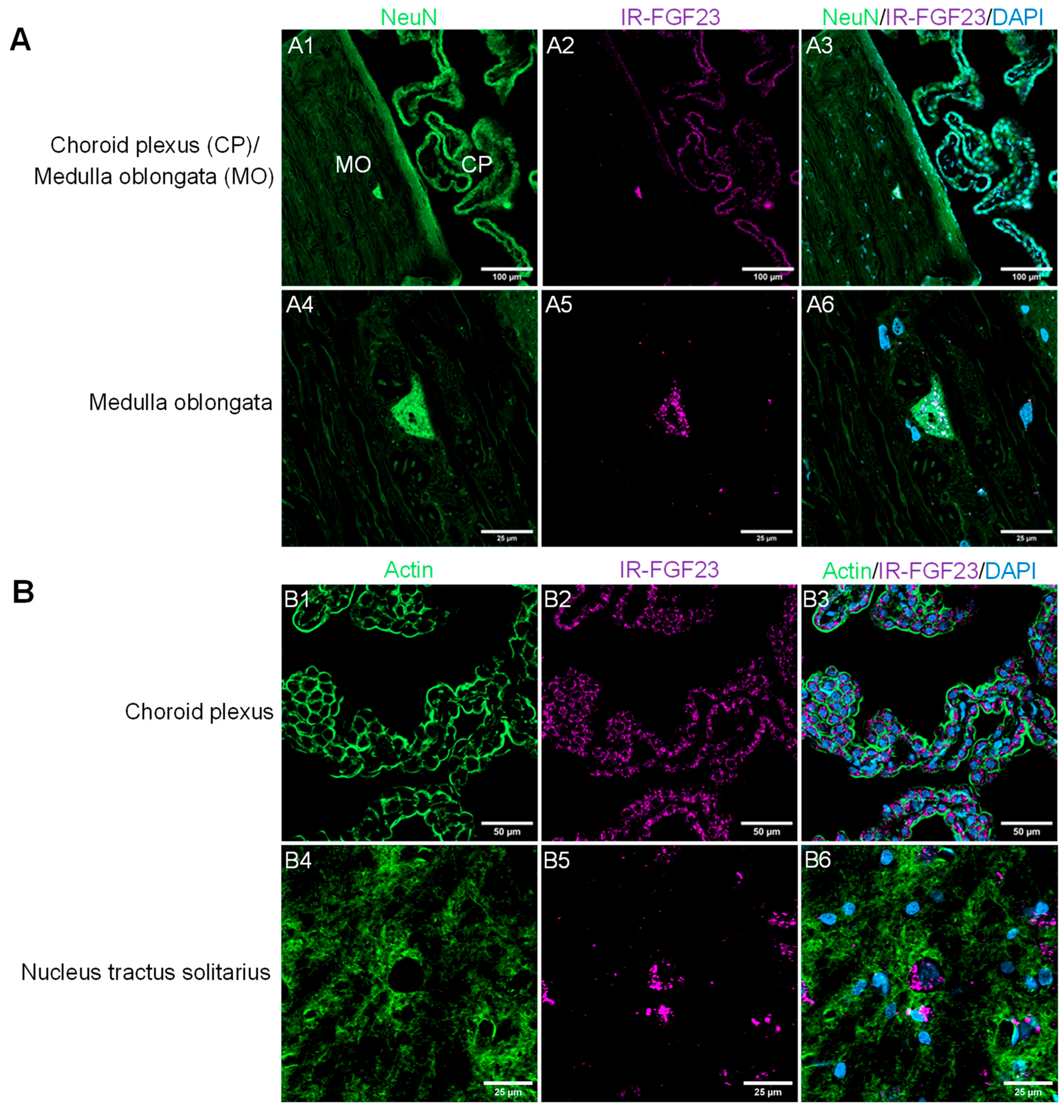 | IV labeled FGF23 | Detected in the choroid plexus and brainstem regions | Rat | Direct |