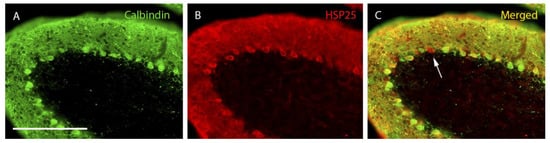 PCD lobe X at P30. Purkinje cells labeled with calbindin (A, green), HSP25 (B, red), and both markers (C, merged). Immunoreactivity for HSP25 is distributed homogeneously throughout the entire extension of the Purkinje cell layer of lobe X in PCD mice. In C, a Purkinje cell expressing HSP25 but not calbindin can be distinguished (arrow). n = 7 for this experiment. Scale bar 400 µm.