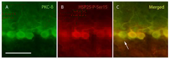 PKC-δ and HSP25-P-Ser15 labeling. Images corresponding to lobe X of a PCD mouse at P25 showing four complete Purkinje cells labeled with PKC-δ (green, (A,C)). Three of these neurons colocalize with HSP25-P-Ser15 (red, (B,C)), but some exceptions can be also observed (arrow). n = 5 for this experiment. Scale bar 50 µm.