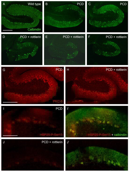 Effect of rottlerin (PKCδ inhibitor). (A–F), sagittal sections of lobe X of wild-type (A), untreated PCD (B,C), and PCD mice administered with rottlerin (D–F) at P30, in which Purkinje cells are labeled with calbindin (green); note that the Purkinje cell layer is preserved in standard mutant mice, but rottlerin prevented this protection. (G,H), sagittal sections of lobe X in mutant mice; the staining of PKC-δ (red) is similar in PCD animals independently the administration of rottlerin. (I–J), HSP25-P-Ser15 labeling (red) in lobe X of PCD mice is dramatically reduced by rottlerin administration. (I’–J’) calbindin staining (green) is overlaid to the HSP25-P-Ser15 one; note that in untreated PCD mice virtually all Purkinje cells at P30 express the active form of HSP25 (I’), whereas scarce neurons do that in rottlerin-administered mutants, and such expression is much weaker (J’). n = 2 for each genotype in this experiment. Scale bar 200 µm for (A–H) and 100 µm for (I–J’).