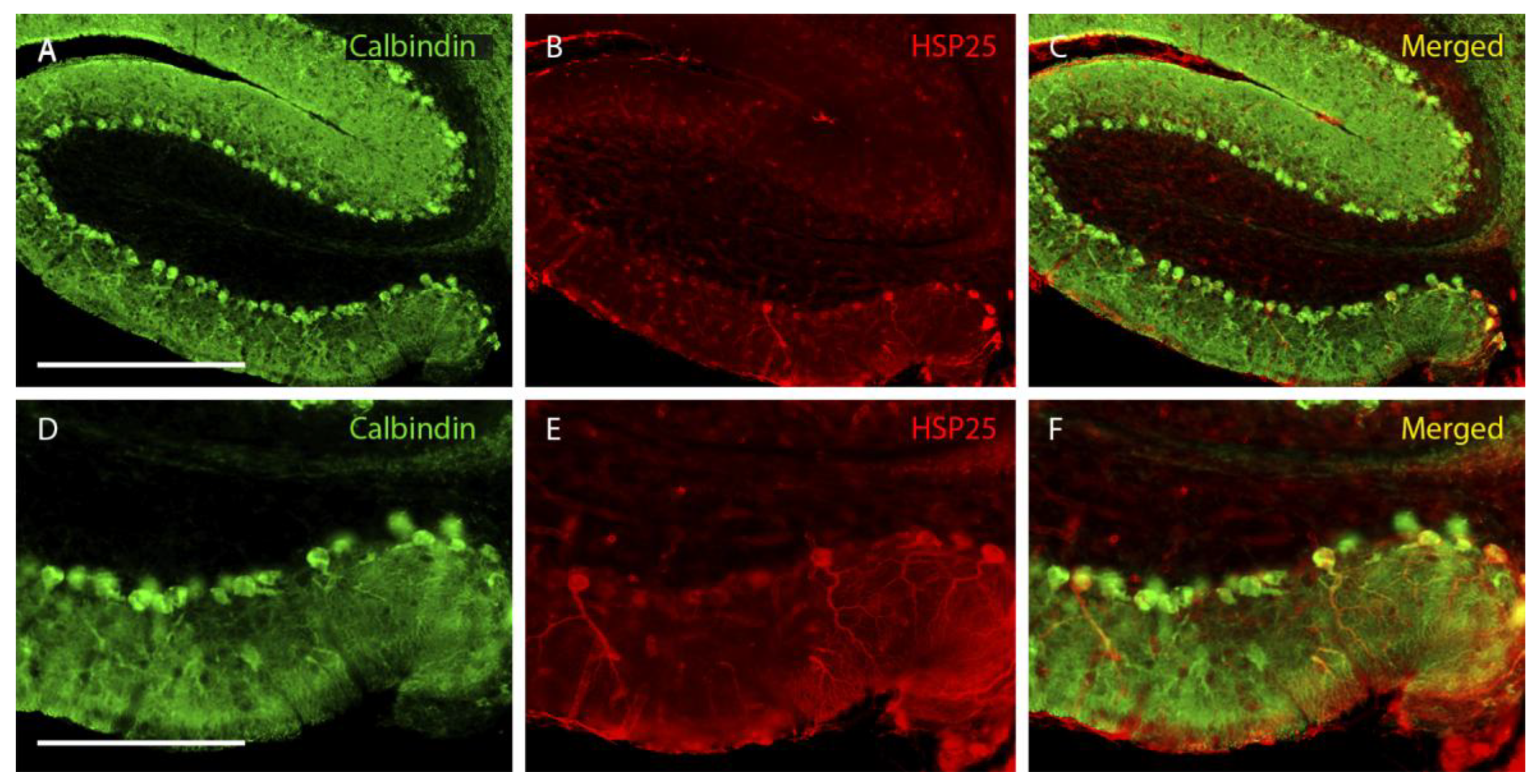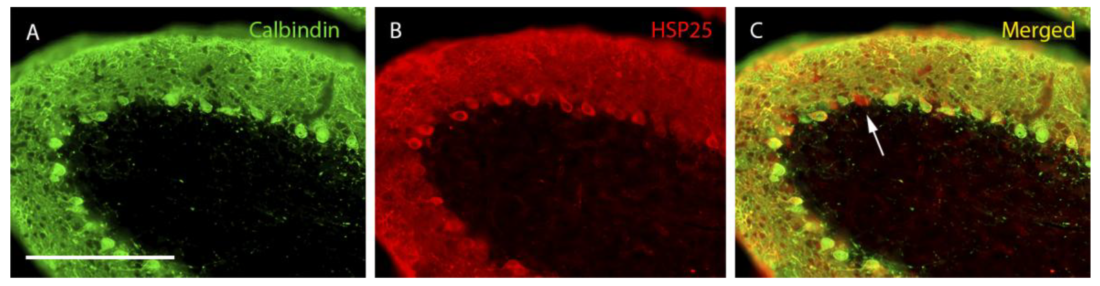 - Armstrong, C.L.; Krueger-Naug, A.M.; Currie, R.W.; Hawkes, R. Constitutive expression of the 25-kDa heat shock protein Hsp25 reveals novel parasagittal bands of purkinje cells in the adult mouse cerebellar cortex. J. Comp. Neurol. 2000, 416, 383–397. [Google Scholar] [CrossRef]