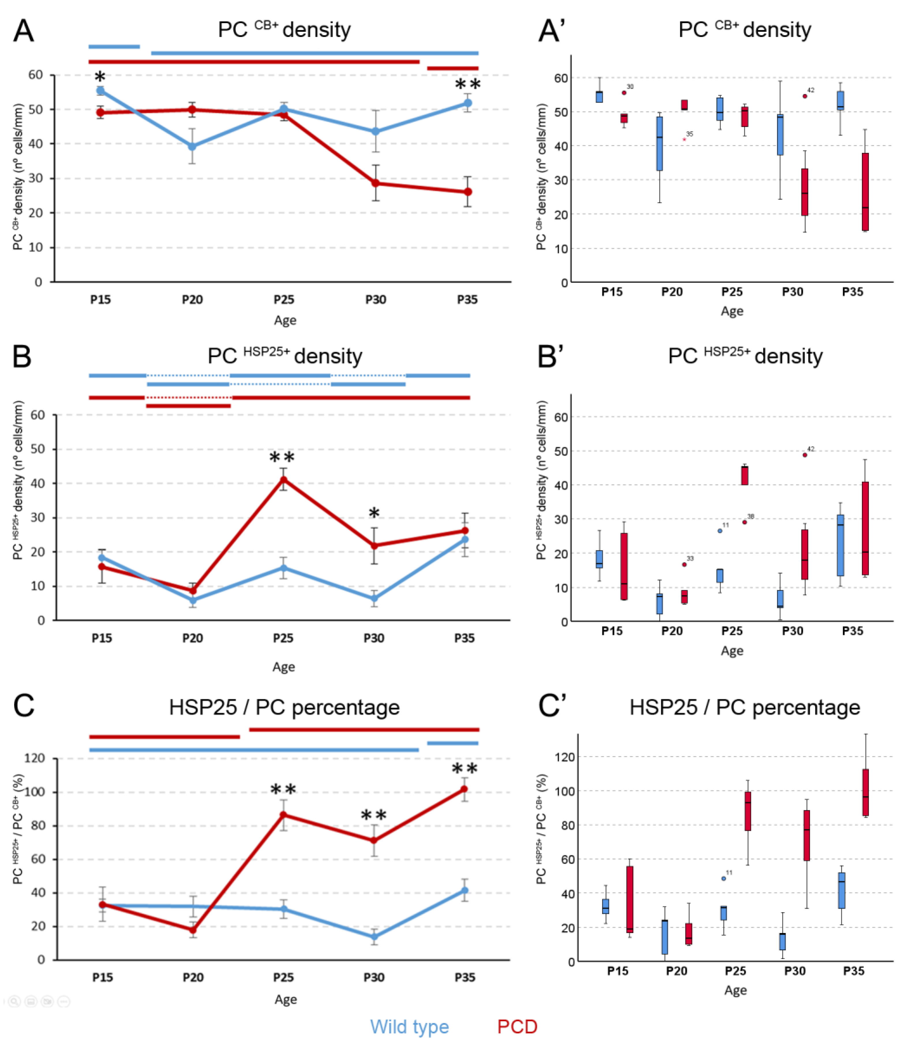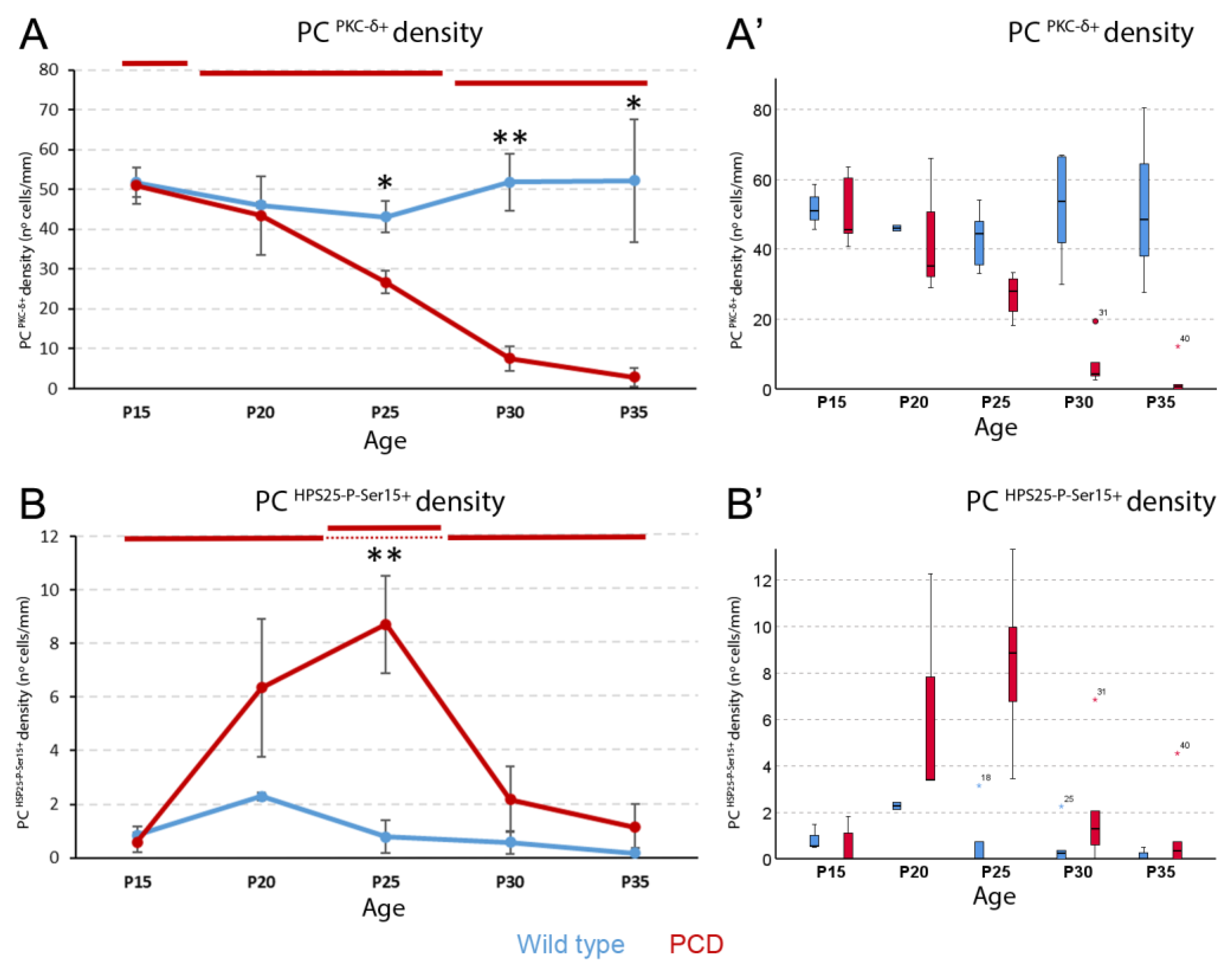 2.1. PCD Mice Show Higher Rates of HSP25 Expression
