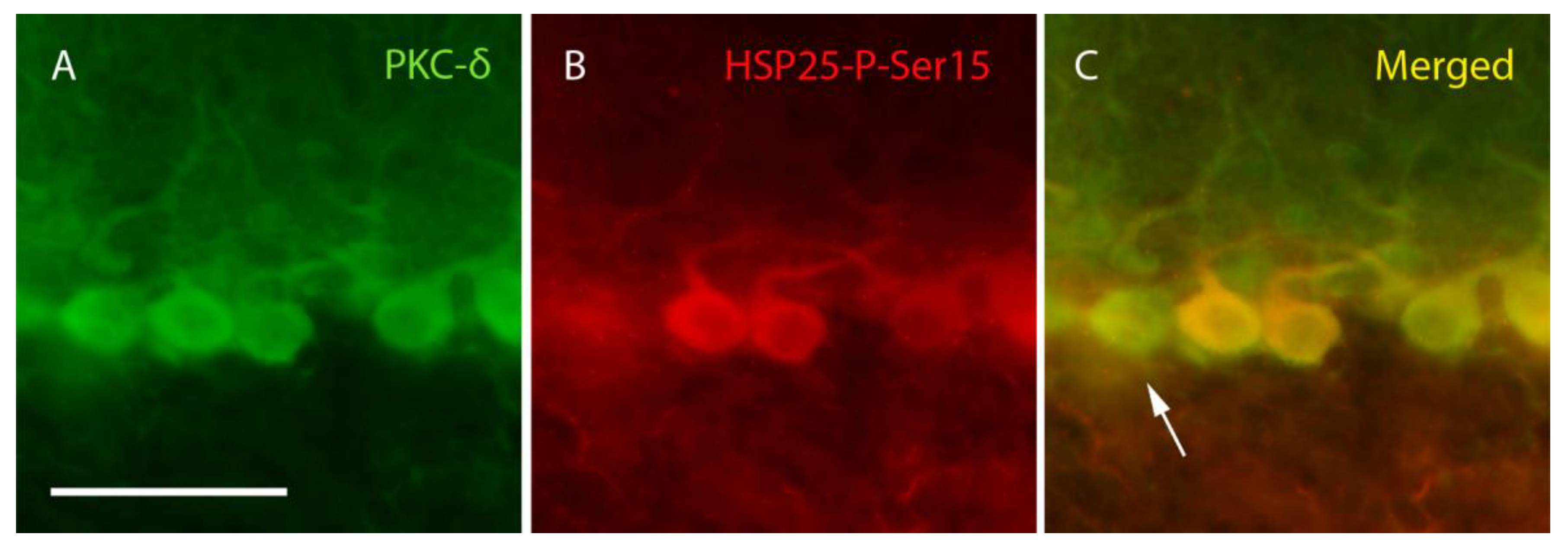 3.3. PKC-δ Is Constitutively Expressed and HSP25-P-Ser15 Is Upregulated During Neurodegeneration