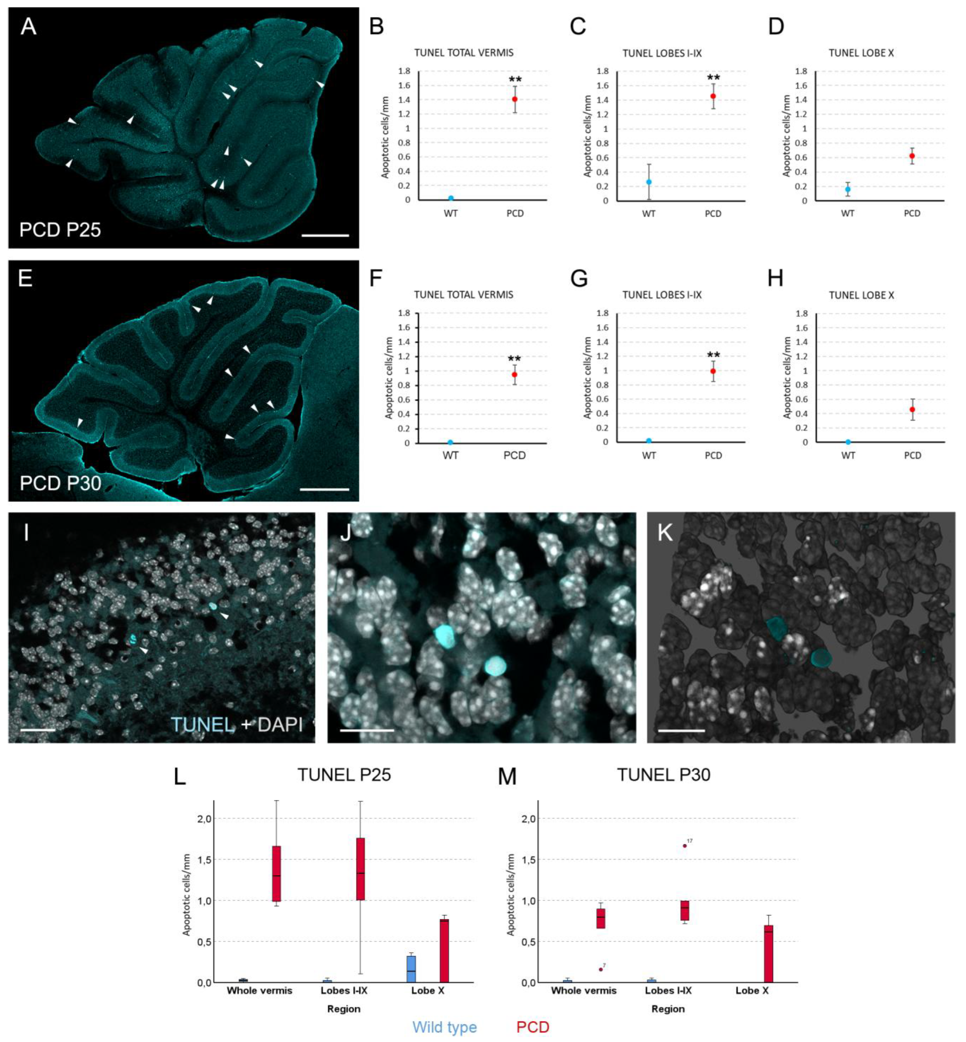 3.1. Differences Between the Purkinje Cell Densities of PCD and Wild-Type Animals Appear Before Neurodegenerative Stages
