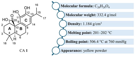 CA 1 is a tricyclic diterpenoid with a planar abietane skeleton, featuring two six-membered rings (A and B rings) fused onto a third ring C which is a catechol (Figure 1) [18,19,21,42]. The two cyclohexane rings A and B form a trans ring junction, generating stereogenic centers at C5 and C10 [42,43,44]. A carboxyl group is present at C20 [18,19,21,42]. CA 1 is often also classified as a polyphenol owing to the presence of the catechol in its structure [22]. The physicochemical properties of CA 1 are presented in Figure 1.