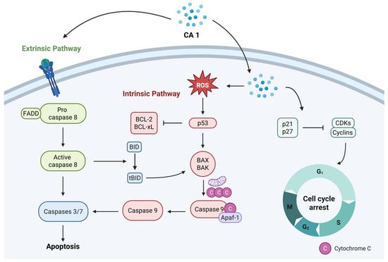 In Caki renal carcinoma cells, CA 1 induces apoptosis via both intrinsic and extrinsic pathways [76]. The intrinsic pathway is activated through CA 1-induced ROS generation, which leads to the activation of the tumor suppressor p53. This, in turn, triggers mitochondrial dysfunction, promoting cytochrome c release and caspase-9 activation. In the extrinsic pathway, CA 1 enhances the expression of death receptors 4 and 5 (DR4 and DR5), and activates caspase-8, which are hallmarks of this apoptotic pathway. Furthermore, CA 1 suppressed Src phosphorylation, leading to a reduction in STAT3 activation. As a result, downstream STAT3 target genes involved in proliferation and survival, such as D-type cyclins, survivin, and c-Myc, are downregulated, contributing to the overall antiproliferative and pro-apoptotic effects of CA 1 in renal carcinoma cells [76].