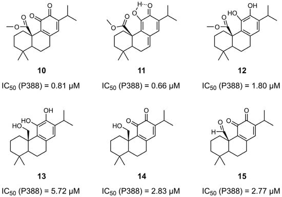 - Aoyagi, Y.; Takahashi, Y.; Satake, Y.; Takeya, K.; Aiyama, R.; Matsuzaki, T.; Hashimoto, S.; Kurihara, T. Cytotoxicity of abietane diterpenoids from Perovskia abrotanoides and of their semisynthetic analogues. Bioorg. Med. Chem. 2006, 14, 5285–5291. [Google Scholar] [CrossRef]