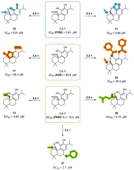 Although CA 1 exerts multifaceted anticancer action, its anticancer potency remains modest, motivating the development of semisynthetic derivatives with improved efficacy. Some of these derivatives exhibited enhanced potency compared with the parent compound, achieving promising results and serving as valuable lead compounds for further optimization. However, some important challenges remain. Many derivatives still show only moderate antiproliferative activity, and their selectivity toward cancer cells often remains insufficient, with some compounds displaying comparable effects in normal cells. This highlights the need for chemical modifications of the CA 1 scaffold to generate derivatives with higher potency and improved selectivity, thereby increasing their therapeutic potential.