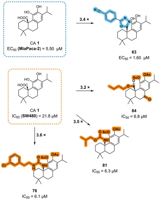Within this context, carnosic acid (CA) 1 has emerged as a particularly interesting molecule. CA 1 is an abietane-type diterpenoid found mainly in Rosmarinus officinalis (rosemary) and Salvia officinalis (sage), both members of the Lamiaceae family [18,19]. Although the therapeutic use of sage and rosemary dates back to ancient times, the investigation of CA 1 properties and its mechanism of action as an isolated compound began only in the early 2000s [20]. Since then, CA 1 has been extensively investigated for its diverse pharmacological properties, encompassing antioxidant, anti-inflammatory, neuroprotective, cardioprotective, antiadipogenic, hepatoprotective, gastroprotective, antimicrobial, antidiabetic, and, notably, anticancer activities [18,20,21,22,23,24,25,26,27,28,29,30,31,32,33]. Accumulating evidence suggests that CA 1 exerts its anticancer effects, both in vitro and in vivo, through multiple mechanisms involving the modulation of the cell cycle, autophagy, apoptosis, oxidative stress, and inflammatory signaling pathways [18,20,21,22,31,32]. Although CA 1 exhibits promising anticancer activity, its moderate potency and selectivity limit its therapeutic potential. To overcome these limitations, chemical modification of the CA 1 has been explored as a strategy to enhance its efficacy [34,35,36,37,38,39,40,41]. Several semisynthetic derivatives of CA 1 have been synthesized and evaluated for their anticancer activities.