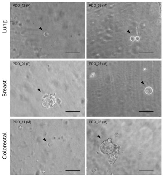 Organoid images. Bright-field images of representative organoids (arrow heads) generated from distinct primary (P) or metastatic (M) biopsies from patients with lung, breast, or colorectal cancer. Scale bar = 100 µm.