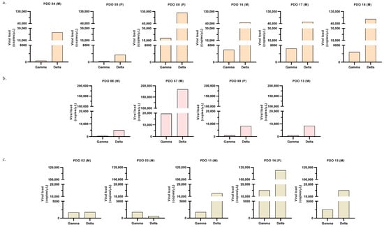Post-infection viral load. Viral load quantified by RT-qPCR 24 h after infection with Gamma or Delta variants, expressed as viral copies/µL. Each graph shows data from a distinct PDO [sample ID, biopsy site (P: primary; M: metastatic)]; for each PDO, one experiment was performed, and each bar corresponds to the mean of two technical replicates from the culture supernatant. Panels correspond to (a) lung (orange graphs); (b) breast (pink graphs); (c) colorectal (beige graphs).