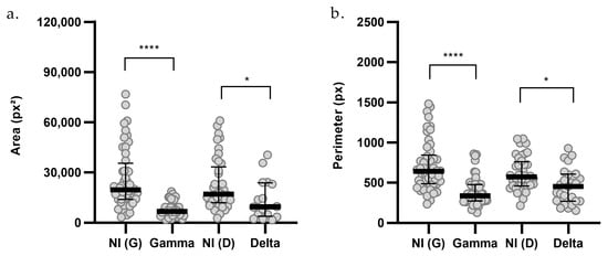 Additionally, perimeter analyses indicated that infection with both the Gamma and Delta variants resulted in reduced organoid size (Figure 5b). Gamma infection led to a 48% decrease in organoid perimeter [G = 335.7; NI(G) = 639.1; p < 0.0001], and Delta infection reduced the perimeter by 21% [D = 451.9; NI(D) = 570.4; p = 0.0143].