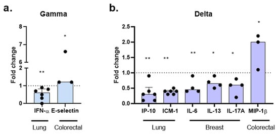 Modulation of immune mediators by SARS-CoV-2 variants in cancer organoids. Molecules were assessed 24 h post-infection with Gamma (a) and Delta (b) variants. Data are presented as fold change (non-infected controls normalized to 1, shown as a dotted line). Each point corresponds to the supernatant from the organoid culture of an individual patient: lung (n = 6), breast (n = 4), and colorectal (n = 3). Statistical analyses were performed using Kruskal–Wallis test, followed by Dunn’s multiple comparisons test. Statistical significance: * p < 0.05; ** p < 0.01.