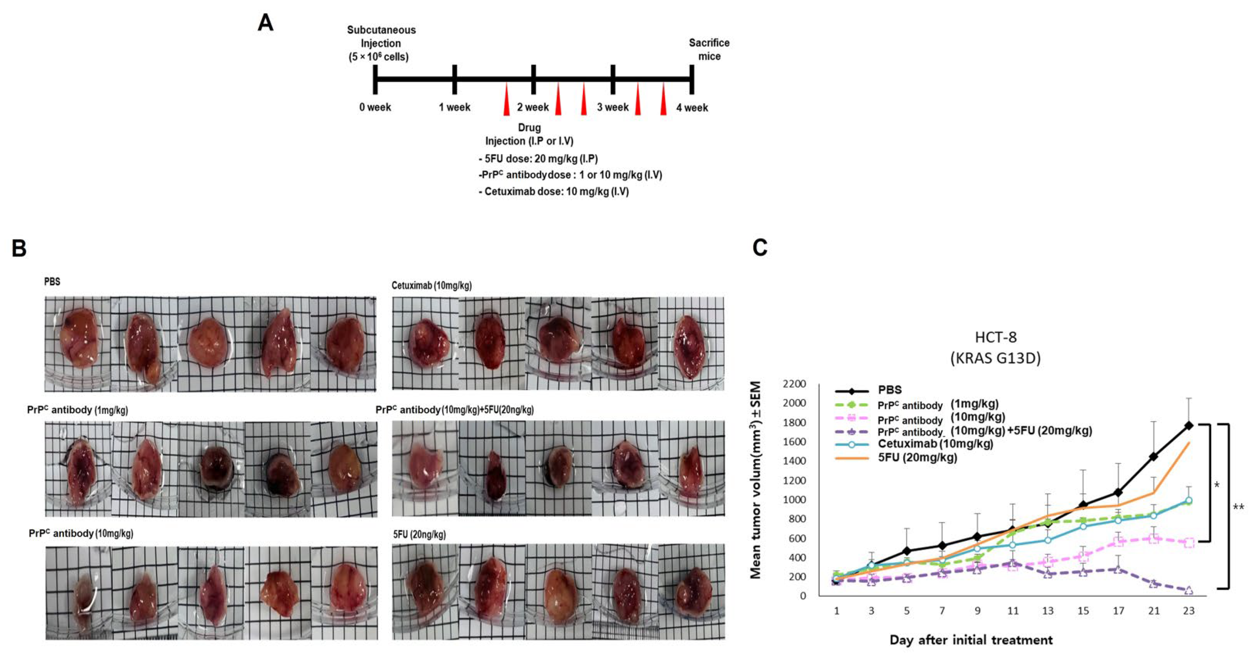 2.7. PrPC Retains Antitumor Activity in a KRAS-Mutant Xenograft and Improves 5-FU Response