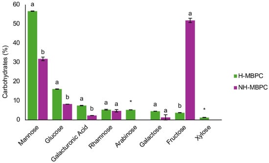 Monomeric composition of H–MBPC and NH–MBPC. Results are expressed as a percentage (%) of total carbohydrates and represent the mean of two independent experiments. Different letters within the same monosaccharide indicate significant differences between treatments (Tukey–Kramer post hoc test, α = 0.05). An asterisk (*) indicates that the monosaccharide was absent in one treatment. All results are expressed on a dry basis.