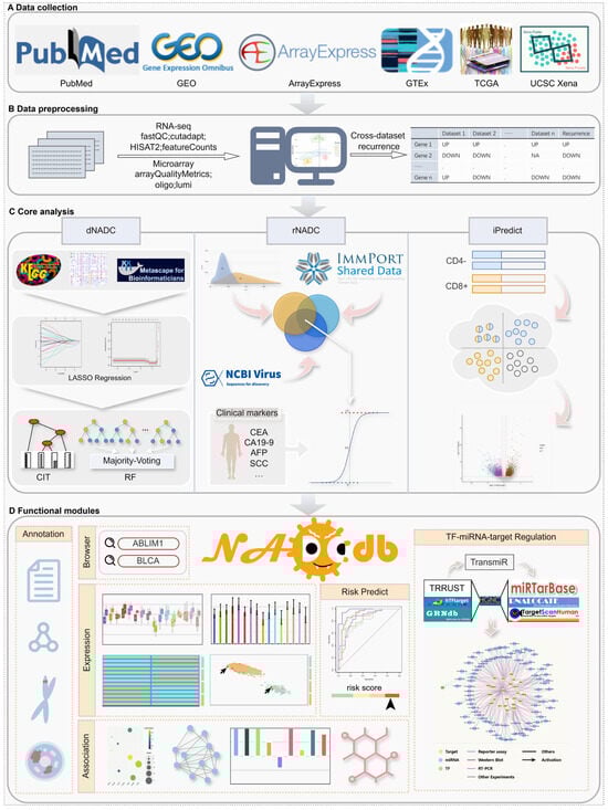 The workflow of NADCdb. (A) Data collection. (B) Standardized data preprocessing pipelines. (C) Core modules for biomarker discovery and risk assessment. (D) Functional modules within NADCdb that facilitate intuitive browsing and exploration of key regulatory factors potentially involved in NADC pathogenesis.