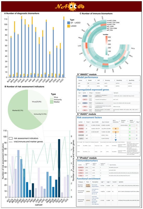 Here, we introduce NADCdb (http://bioinformaticsscience.cn/nadcdb, accessed on 1 January 2026), a publicly available database dedicated to NADCs, employing a joint analysis strategy to systematically assess NADC risk in PLWH and identify key biomarkers across 23 NADC types (Figure 1). NADCdb integrates six core analytical modules: (i) “rNADC” consolidates 314 NADC-specific factors to construct a risk assessment model based on immunosuppression, chronic inflammation, and clinical biomarkers, supplemented with an interactive “rNADC-tool” that allows users to upload independent datasets for personalized risk evaluation; (ii) “dNADC” identifies diagnostic biomarkers by mapping dysregulated genes shared between PLWH and cancer patients onto the Kyoto Encyclopedia of Genes and Genomes (KEGG) [26] regulatory pathways, achieving >90% prediction accuracy in an external validation cohort of HIV-associated clear cell renal cell carcinoma and >75% accuracy for other HIV-associated cancers in internal testing; (iii) “iPredict” innovatively screens 1905 potential immune biomarkers across 16 NADCs using HIV-specific immune signatures (CD4 decline and CD8 elevation) [27,28,29]; (iv)”Regulation” elucidates genome–transcriptome interactions in NADCs by reconstructing transcription factor (TF)-miRNA regulatory networks of key factors; (v) multi-dimensional analyses—including functional enrichment, WGCNA [30], the protein–protein interaction (PPI) network, and drug prediction—further decode NADC regulatory mechanisms; and (vi) two intuitive modules, “Gene” and “Cancer”, facilitate the user-friendly exploration of regulatory relationships between key biomarkers and NADCs via gene- or cancer-specific queries. This comprehensive resource provides novel insights into NADC pathogenesis and serves as a valuable tool for researchers investigating HIV-associated oncogenesis.