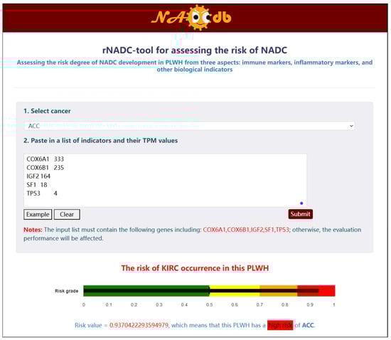 To fully demonstrate the functional capabilities of NADCdb and enhance user service, we developed a user-friendly interactive “rNADC-tool” module based on the “rNADC” model for assessing the risk of PLWH developing 21 NADC subtypes. Within the interface of this tool, users must first select a target NADC subtype for prediction, then input the specified feature names and corresponding expression values in the required format. Upon submission, the system displays the calculated risk score and corresponding risk stratification at the bottom of the page (Figure 5).