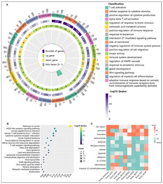 (A) Gene ontology enrichment analysis of 115 key HARC-associated genes. (B) KEGG pathway enrichment analysis of 115 key HARC-associated genes. (C) CMap analysis for potential therapeutic compound identification.