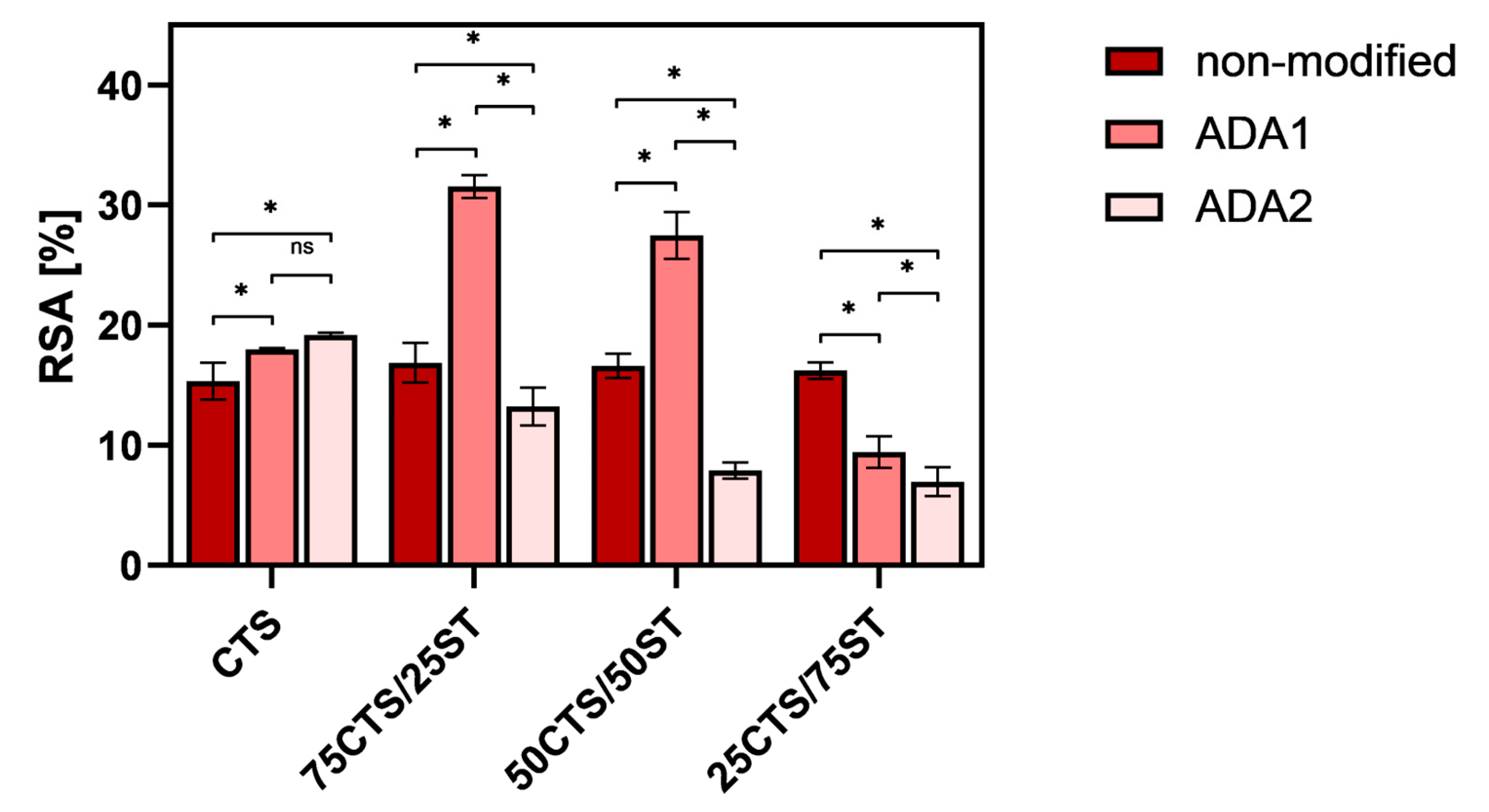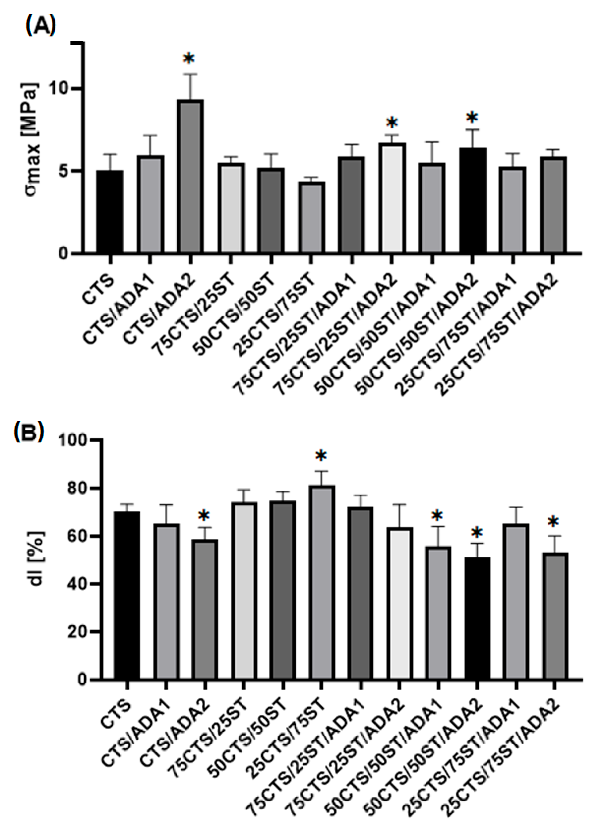 | 75CTS/25ST/ADA1 | 51.40 ± 2.86 * | 76.63 ± 2.19 * | 41.86 ± 0.91 | 9.90 ± 0.30 | 31.96 ± 0.61 |