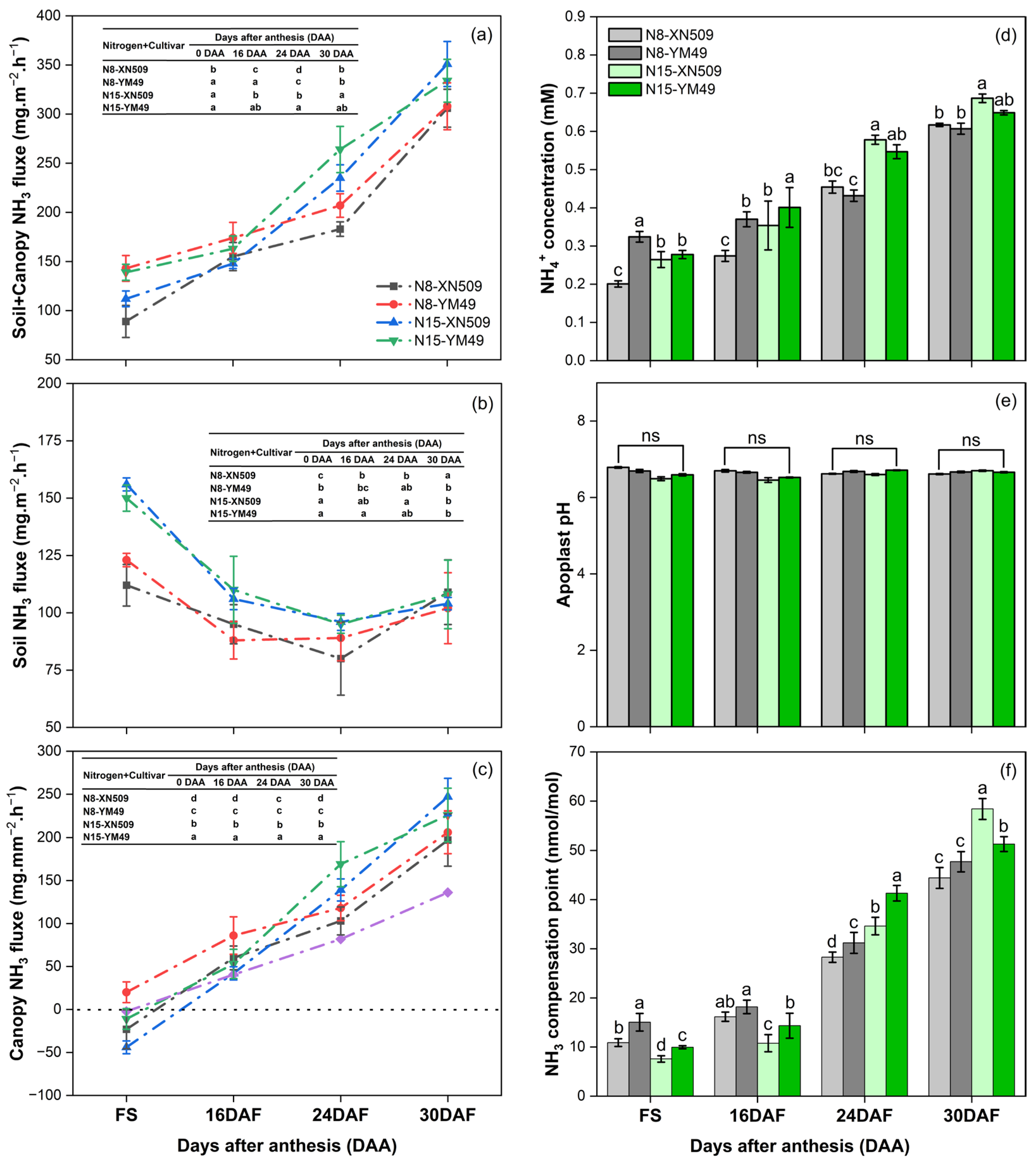Several methodological limitations should be considered in this study. First, the use of a static acrylic chamber for in-situ NH3 flux measurement may lead to a slight underestimation of flux due to NH3 adsorption onto the chamber walls. Second, the canopy flux separation procedure involving plant removal may temporarily alter the local microenvironment, introducing uncertainty into flux calculations. Additionally, the NH3 compensation points reported here are model-based estimates derived from apoplastic NH4+ and pH. Their calculation relies on specific assumptions and may be influenced by dynamic field conditions, which carry inherent uncertainty. Despite these potential limitations, the consistent and significant treatment responses observed in both flux and biochemical data strongly support the robustness of the key comparative conclusions drawn regarding cultivar differences and nitrogen management effects.