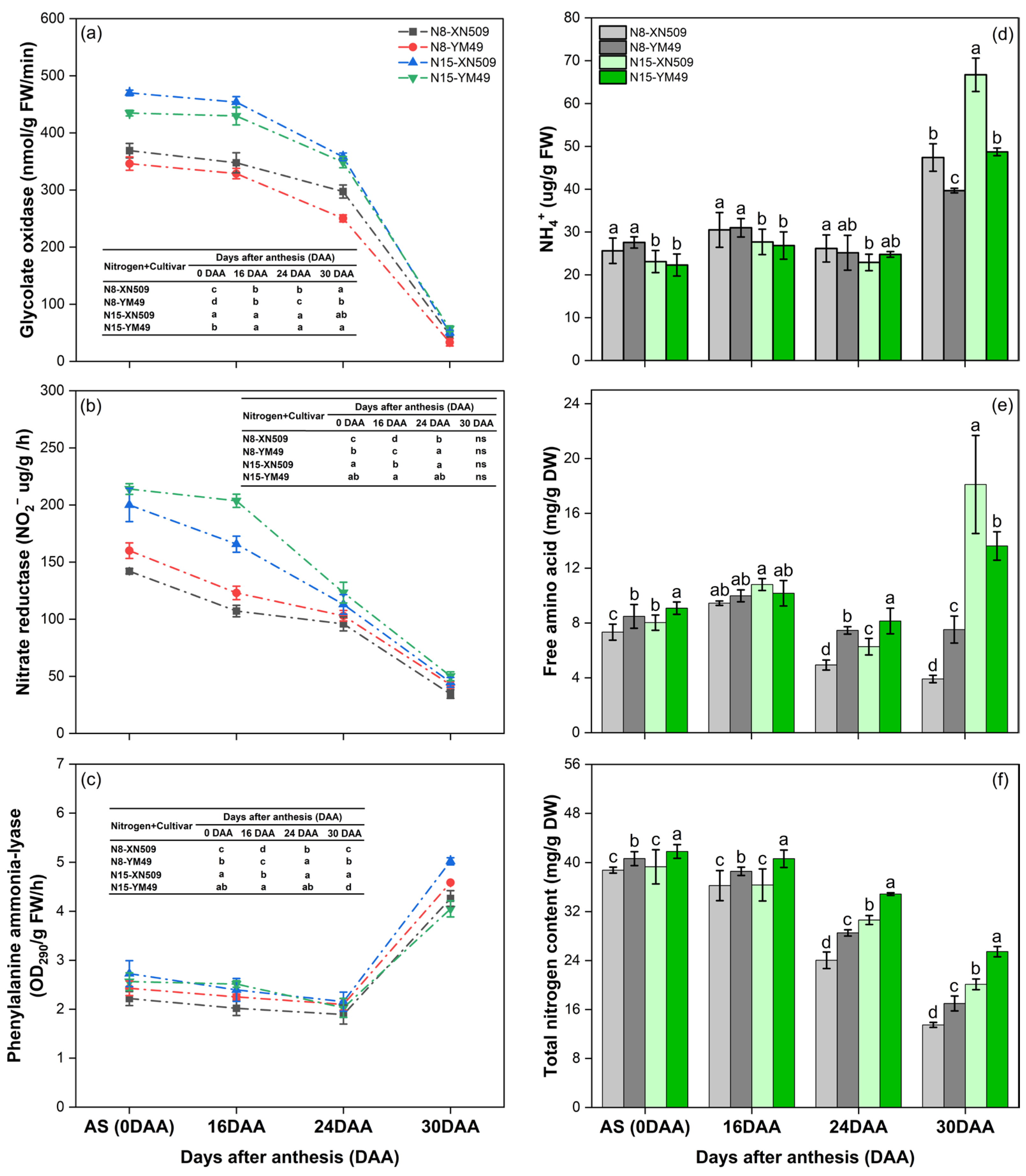 −1 during anthesis and the late grain-filling stages. Leaves from nitrogen-treated plants exhibit significantly higher NH