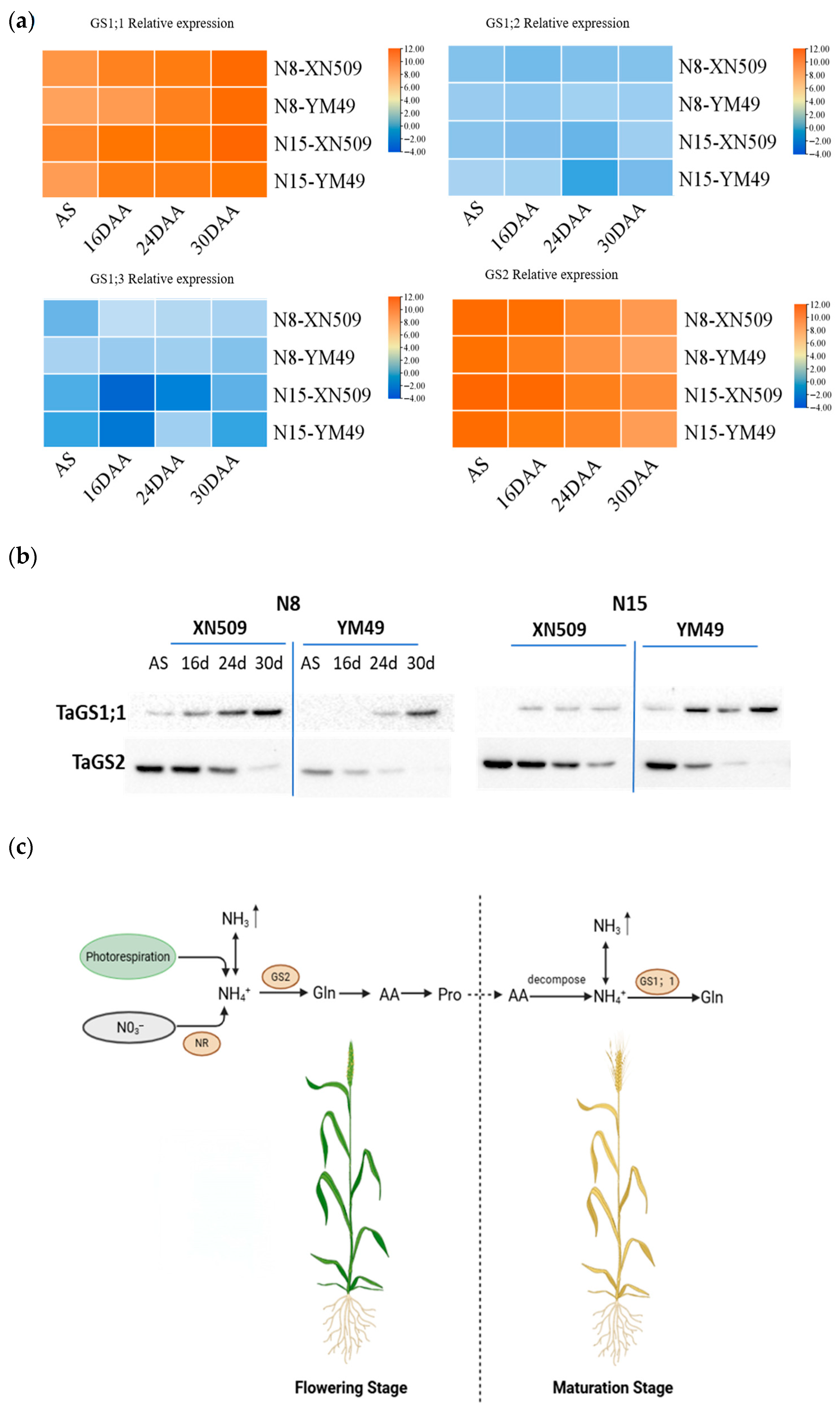 27]. Notably, TaGS2 expression declines sharply during leaf senescence, contributing significantly to the reduction in overall GS activity [