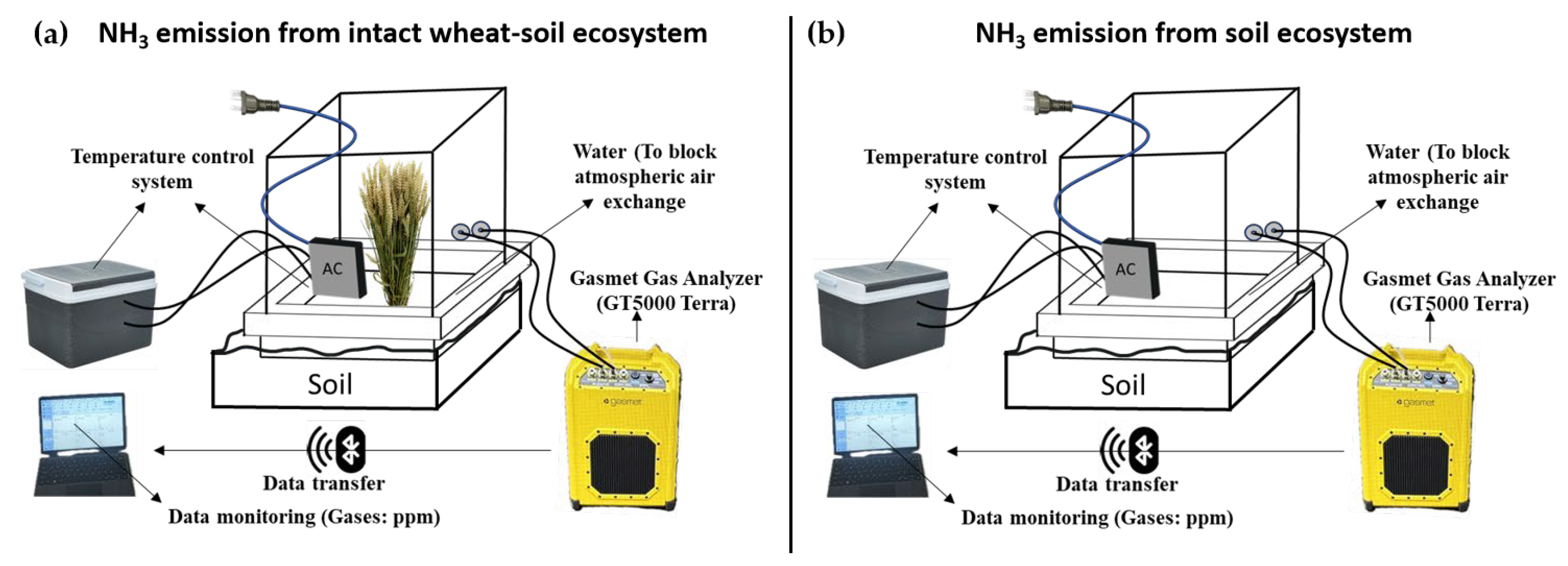 2) was conducted immediately before and after each measurement to minimize any background signals or measurement offsets. The base of the chamber is a 0.6 m × 0.6 m metal frame, which was buried 10 cm into the soil three days prior to ammonia measurements. The chamber was ventilated before each measurement and placed on top of the base, then sealed using a water seal. Following chamber placement, measurements were taken over a 5-min period to capture a stable change in gas concentration. During the measurement process, an external gas cooling device was used to maintain the temperature inside the chamber in alignment with the ambient temperature.