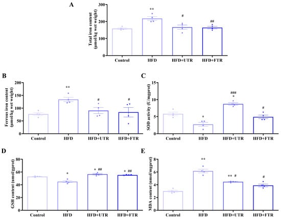 Exercise improves oxidative stress in the gastrocnemius muscle of sarcopenic obese mice induced by high-fat diet (HFD). (A) HFD induces an increase in the total iron content of the gastrocnemius muscle in mice, while exercise intervention reduces the total iron content of the gastrocnemius muscle in mice (n = 4); (B) HFD induces an increase in the divalent iron content of the gastrocnemius muscle in mice, while exercise intervention reduces the divalent iron content (n = 4); (C) HFD induces a decrease in the SOD enzyme activity of the gastrocnemius muscle in mice, while exercise intervention increases the SOD enzyme activity (n = 4); (D) HFD induces a decrease in the GSH content of the gastrocnemius muscle in mice, while exercise intervention increases the GSH content of the gastrocnemius muscle in mice (n = 4); (E) HFD induces an increase in MDA content in the gastrocnemius muscle of mice, while exercise intervention reduces MDA content (n = 4). UTR: uphill treadmill running, FTR: flat treadmill running; * compared with the control group, p < 0.05, ** compared with the control group, p < 0.01; # compared with the HFD group, p < 0.05; ## compared with the HFD group, p < 0.01, ### compared with the HFD group, p < 0.01.