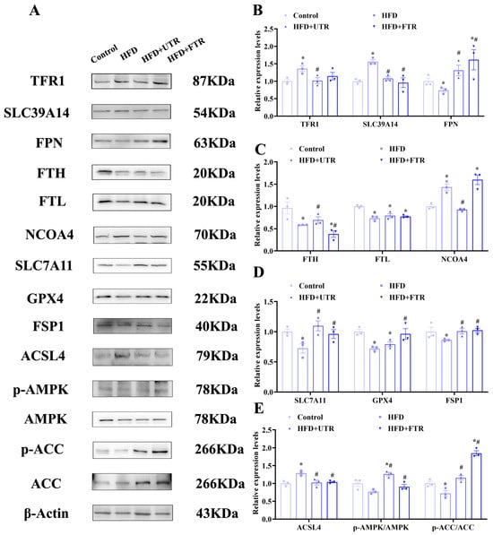 Exercise improves HFD-induced sarcopenic obesity in mice by inhibiting ferroptosis through activation of the adenosine monophosphate-activated protein kinase (AMPK)/Acetyl-CoA carboxylase pathway (ACC) pathway. (A) Expression of ferroptosis-related proteins and AMPK/ACC pathway proteins; (B) expression analysis of TFR1, SLC39A14, and FPN in the gastrocnemius muscle of mice in each group (n = 3); (C) expression analysis of FTH, FTL, and NCOA4 in the gastrocnemius muscle of mice in each group (n = 3); (D) expression analysis of SLC7A11, GPX4, and FSP1 in the gastrocnemius muscle of mice in each group (n = 3); (E) expression analysis of ACSL4, phosphorylated AMPK (p-AMPK), and phosphorylated ACC (p-ACC) in the gastrocnemius muscle of mice in each group (n = 3). * Compared with the control group, p < 0.05, # compared with the HFD group, p < 0.05.