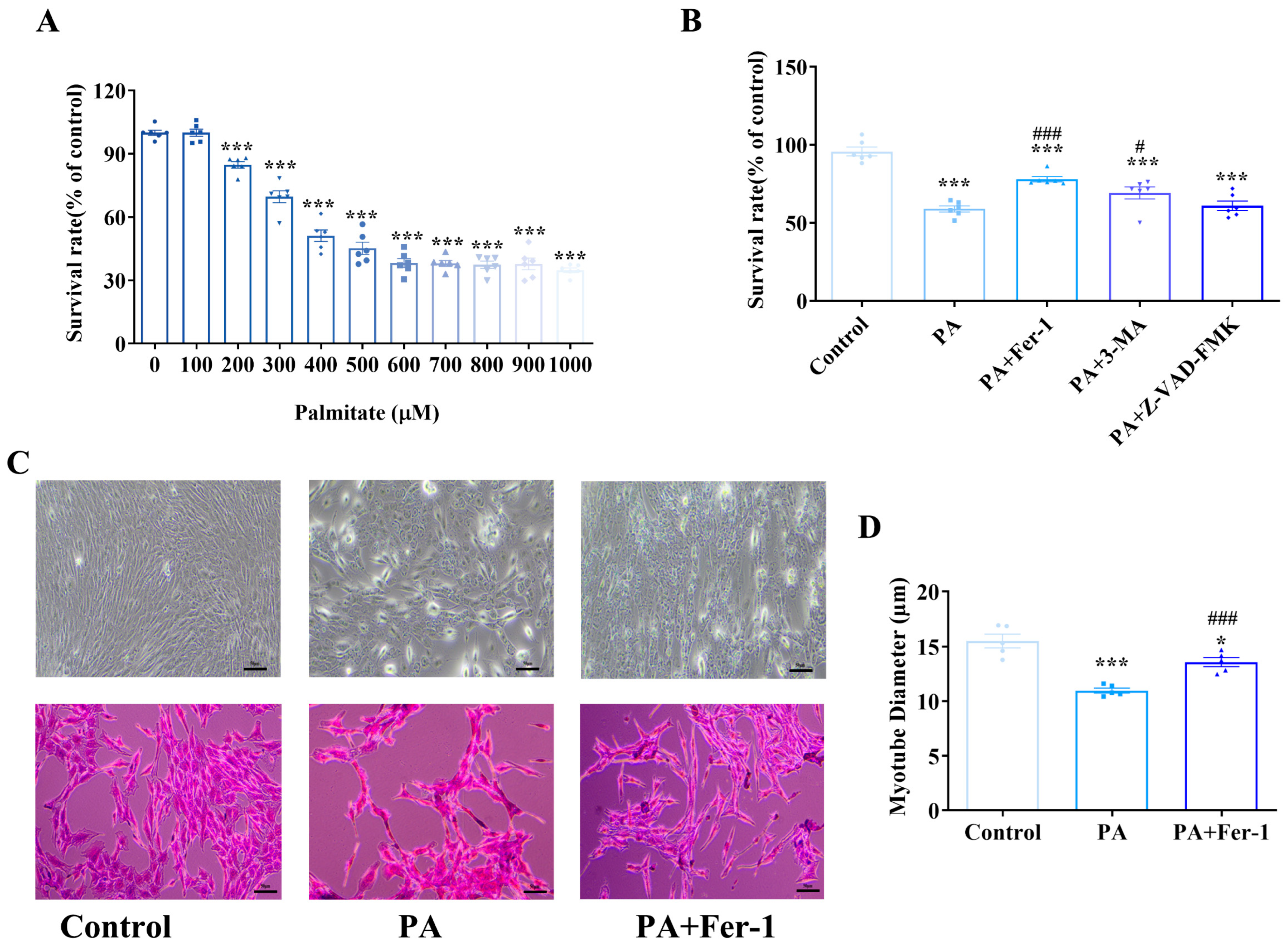 2.1. Ferroptosis Contributes to Palmitic Acid-Induced Inhibition of Proliferation and Myogenic Differentiation in C2C12 Cells